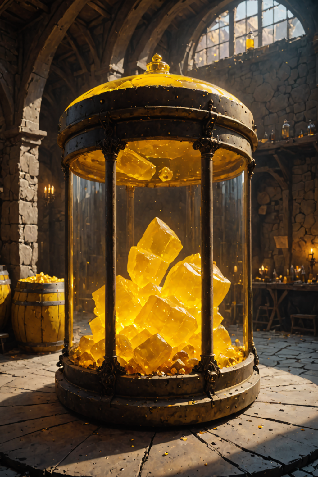 ultra realistic 8k cg, flawless, clean, masterpiece, professional artwork, famous artwork, cinematic lighting, cinematic bloom, (((photo raw)), background), a large yellow glass medieval container with a tavern inside, yellow rock <lora:Contained_Color_SDXL:1> hyperreality, concept photography