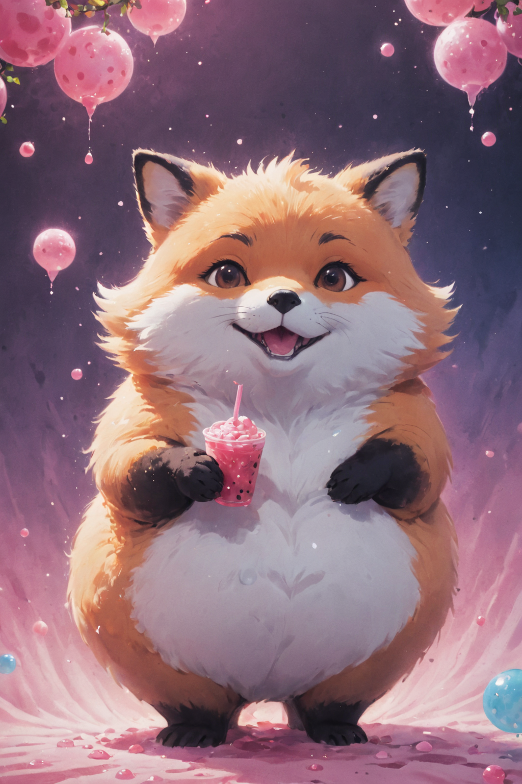 cosmic canvas,flawless, clean, masterpiece, professional artwork, famous artwork, painting of a chubby fox, (bubble tea background), <lora:Cosmic_Canvas_SDXL:1>