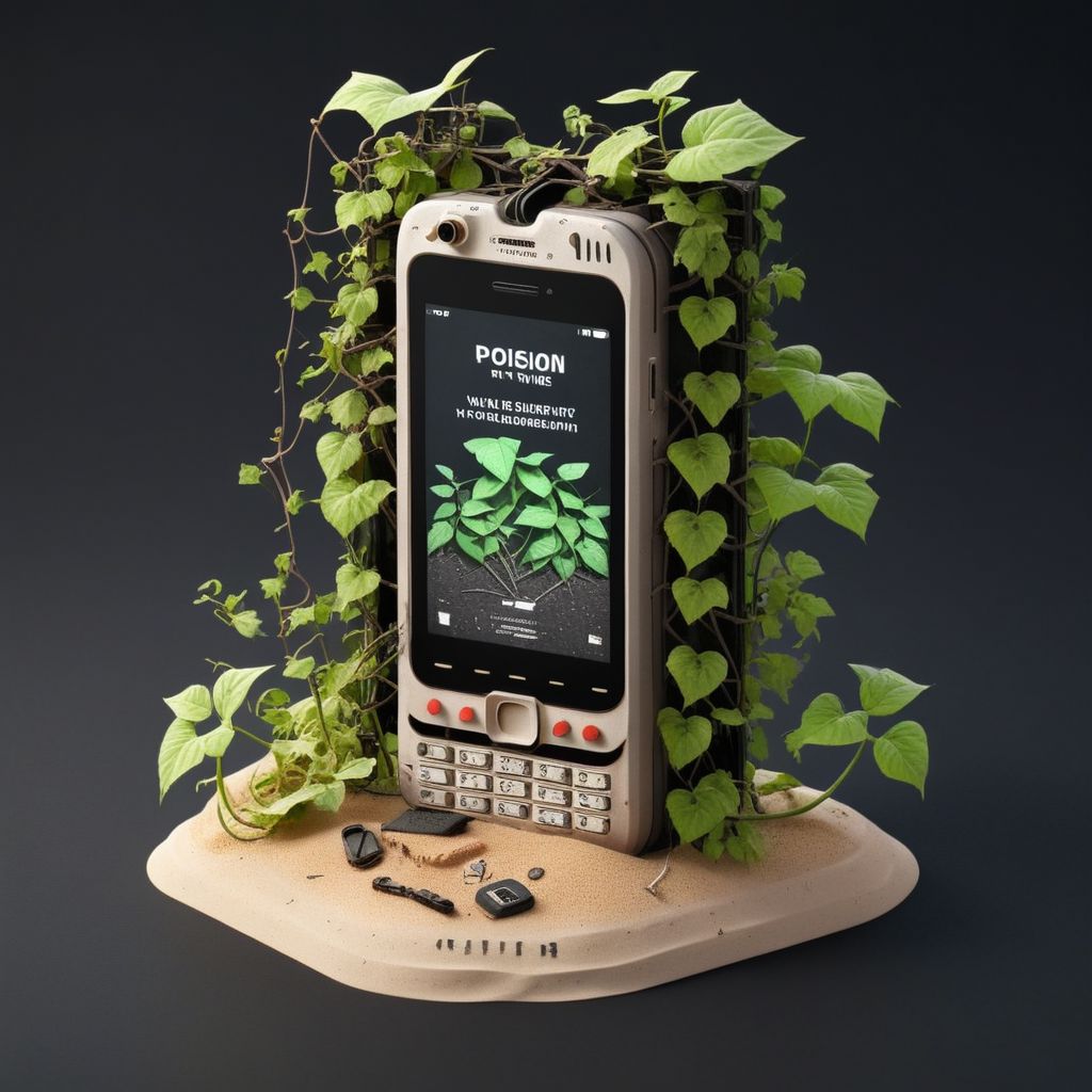 isztoksk, 3d render of a mobile phone lost to the sands of time, poison ivy, vines, post apocalyptic, black background, no humans, english text, simple background, 3d, miniature, isometric, game design, octane render, masterpiece, best quality