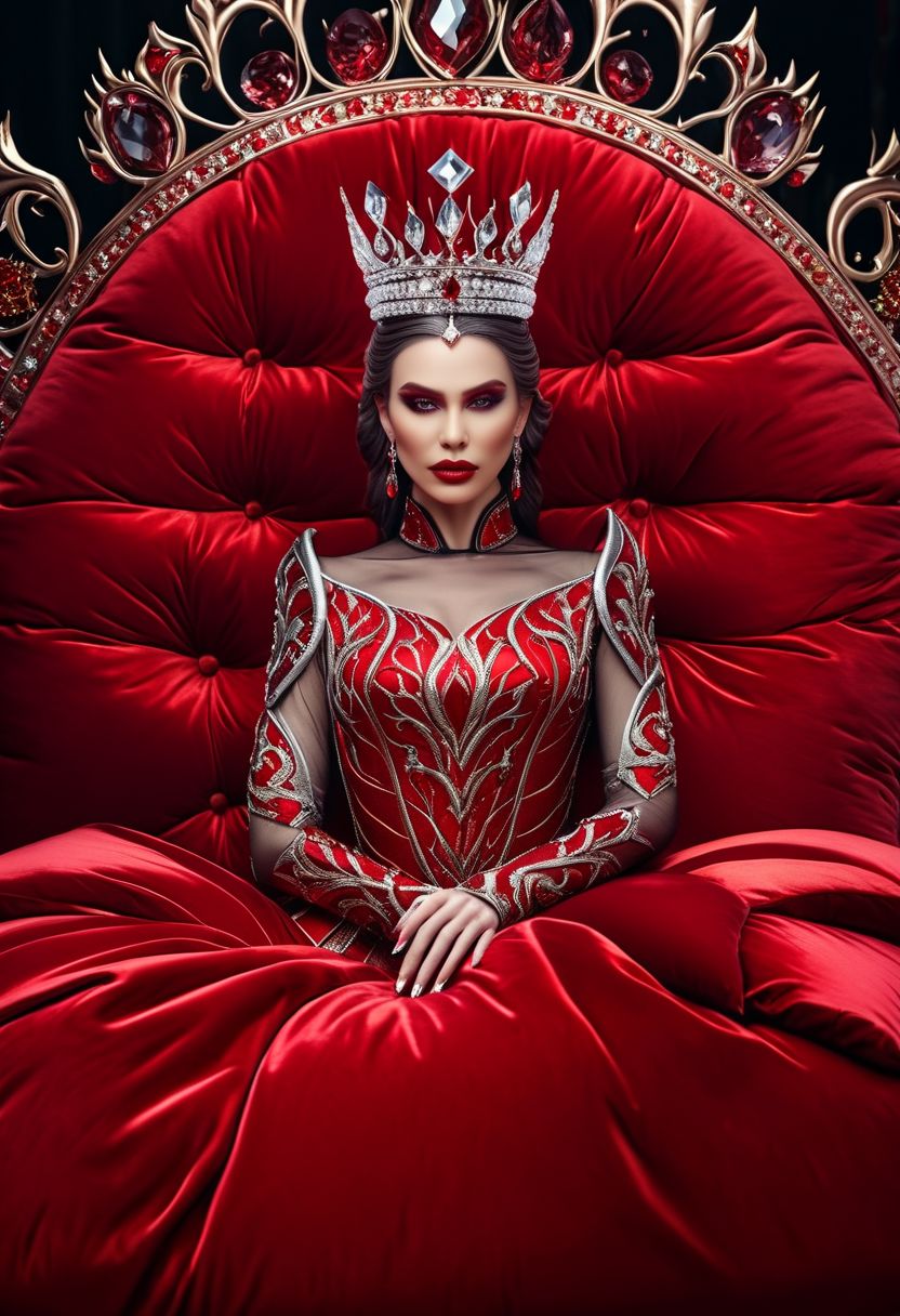 An alluring fire EMPRESS with a crystal crown sitting on big red pillows, captivating fashion shoot, professional photo, 8k, high detailed, very realistic.