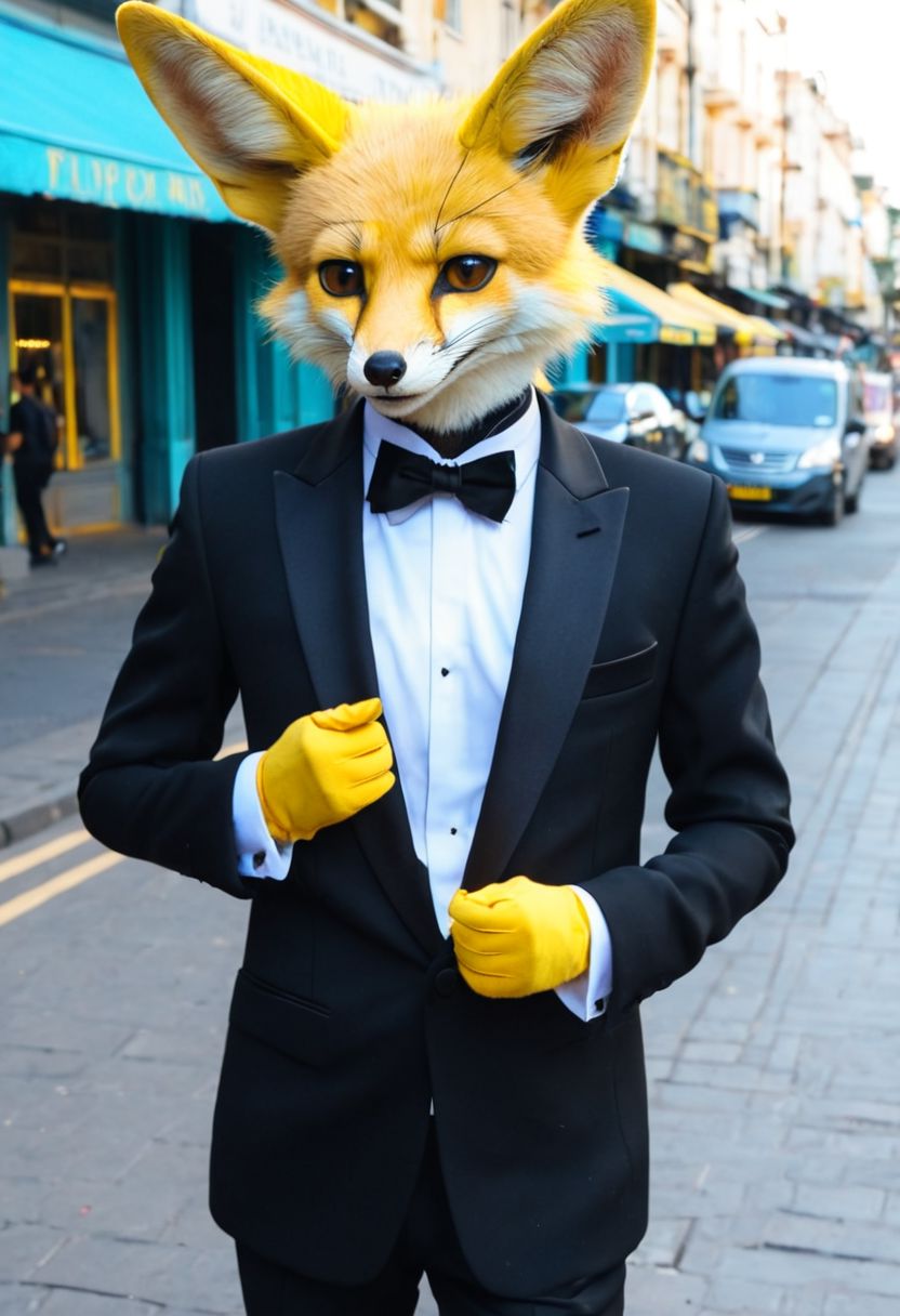 a man posing for a picture in the street, close shot, portrait, wearing tuxedo black suit with a yellow fennec drawn on it