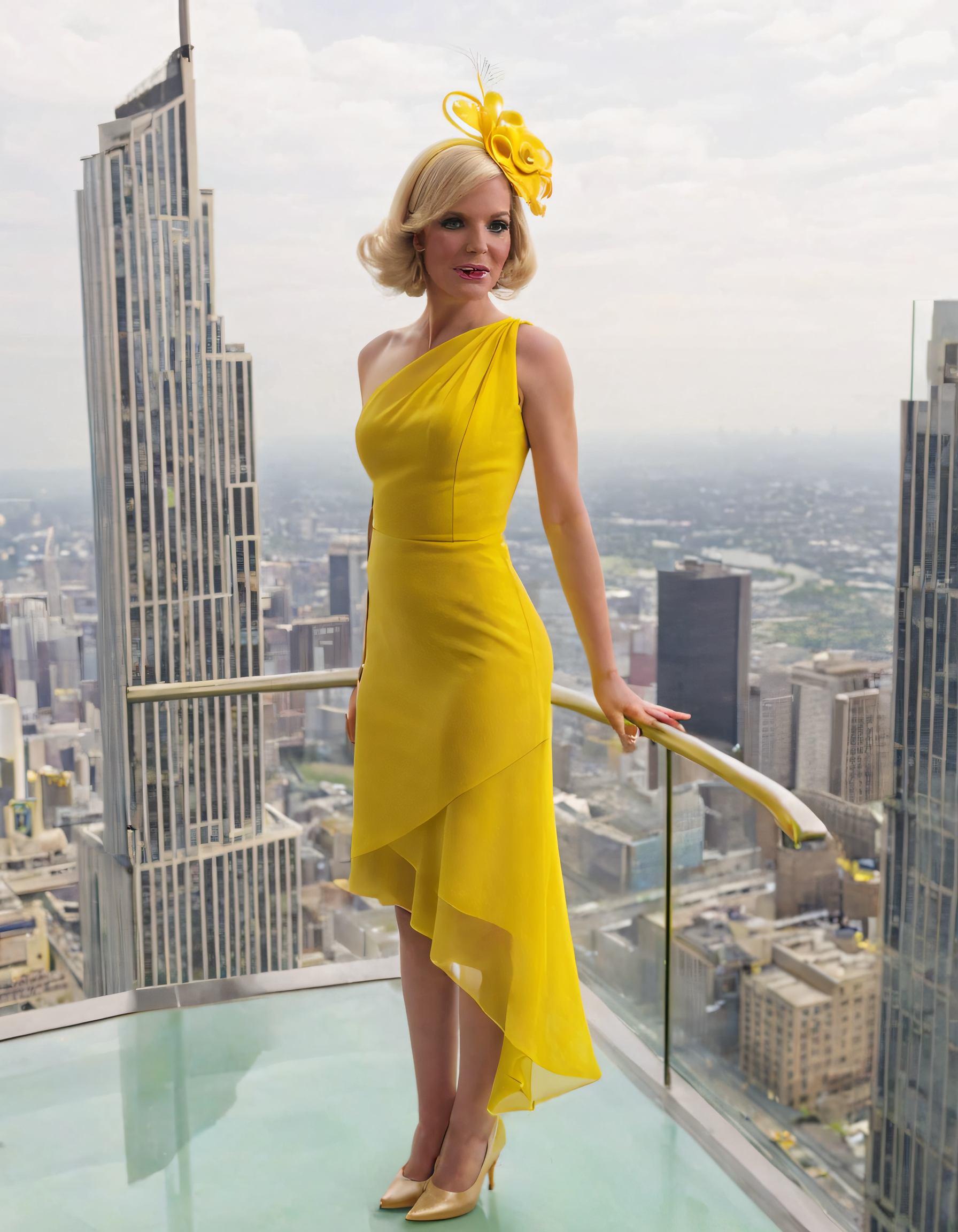 With blonde hair cascading over her shoulders, a solitary Bobbi stands as the epitome of grace atop a towering glass skyscraper, gazing introspectively across the sprawling cityscape below while adorned in a vibrant yellow dress with an asymmetrical hemline and matching fascinator. <lora:pvnqxk18fcb387a01y161:1>