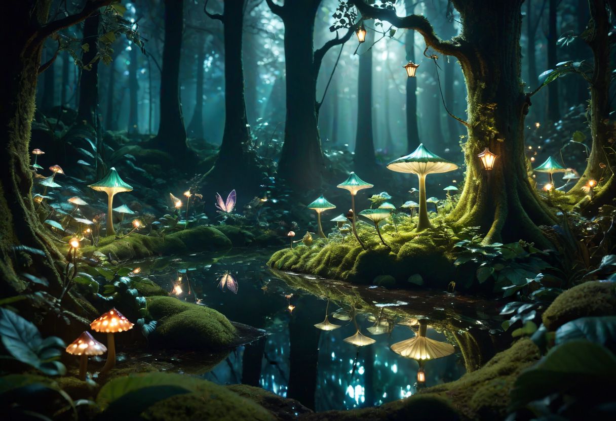 Neo Surrealism, whimsical art. Generate an illustration of a fairy forest with fairies playing. ((photorealistic)) rim lights, dark shadows, cinematic scene , movie shoot , dark, zPDXL , , extremely detailed, glass reflection, dark shadows, hard light hard shadows,, shallow depth of field, vignette, highly detailed, high budget Hollywood film, cinemascope, moody, epic, gorgeous