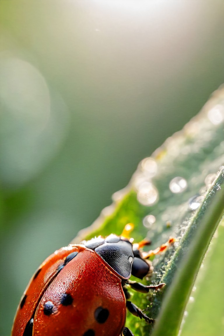 a photo shot in the point of view from the back of a a ladybug's head antenas close-up on the lower side of the shot, the background is a giant leaf macro-shot, sun rays <lora:HeadPOV_from_behind_vk1-000018:0.85>, natural lighting, 4k, high quality, Fujifilm XT3