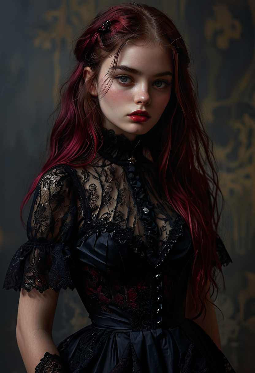 Digital painting by Dan LuVisi, ultra-detailed, photorealistic, dark and moody composition, 22yo woman in a diminutive black and deep purple translucent dress, intricate lace gothic stockings and garters, asymmetric skirt, long red and black hair cascading down, posing waist-high with a hint of defiance, sharp focus, trending on ArtStation <lora:add-detail-xl:1> <lora:princess_pony_v1:0.1> <lora:MJ52:0.5>