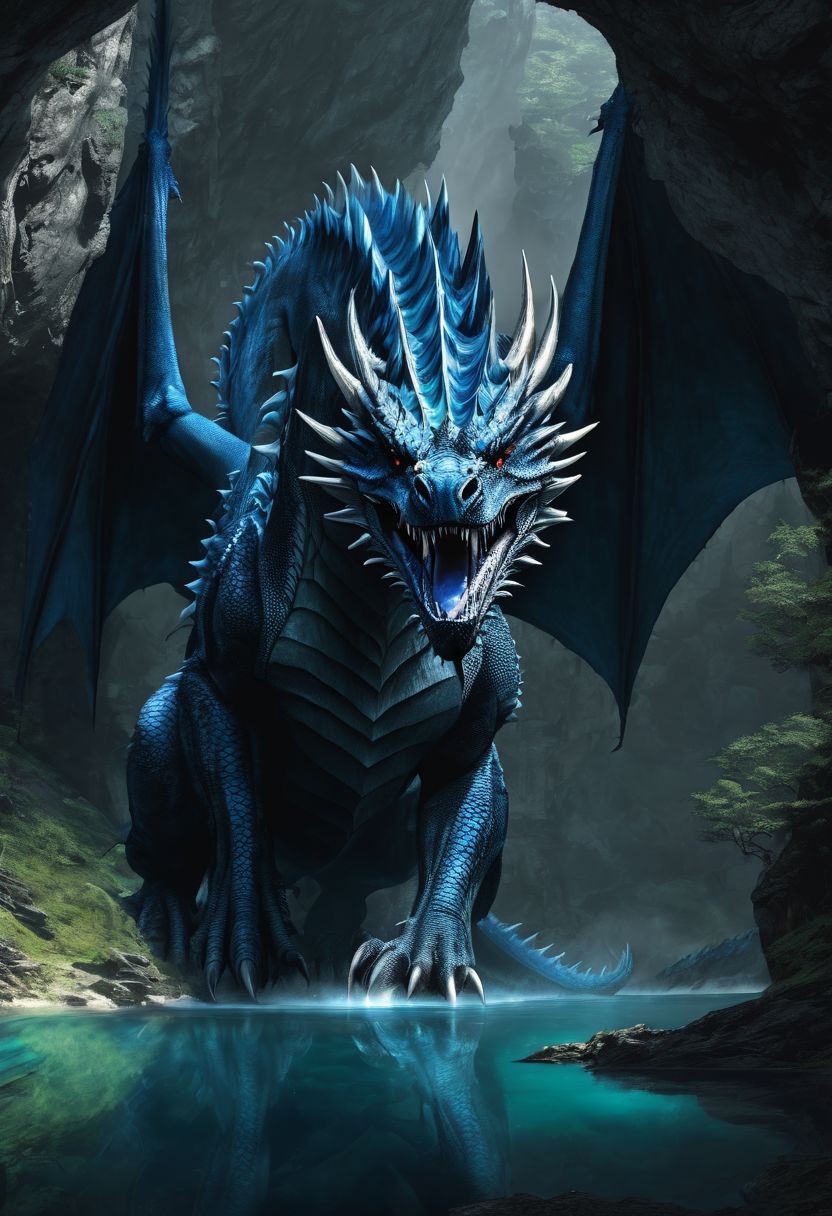 a blue dragon, dungeons and dragons, huge dragon, blue, magic speel, dark ambience, lake, dark cave