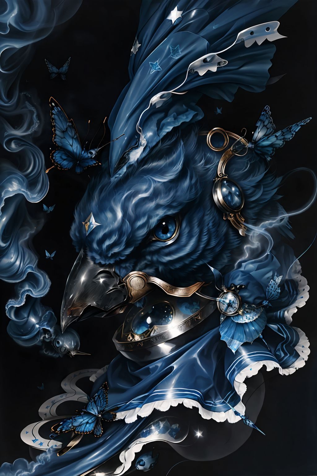 surreal00d, Lone Star Tick, Blue grosbeak, opulent, blue smoke, butterfly, <lora:surreal00d-000010:1>