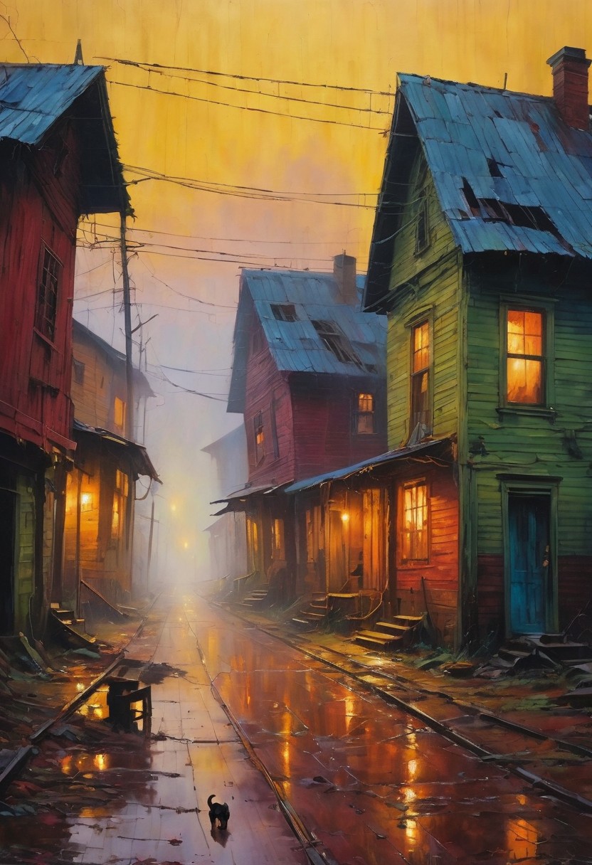 Colorful oil painting. Old dilapidated houses. Very beautiful, gouache, Cinematic, dark, Nasty, mysterious, modern vintage, rich deep colors, boho style. The fog is thick fog. ultra-stunning lighting. (Dog on a Chain) lithographic detail, dirt in every crevice; conceptual art, super detail, amazing composition. hyperrealistic photography, --niji 5 --ar 2:3 --expressive style --v 5.