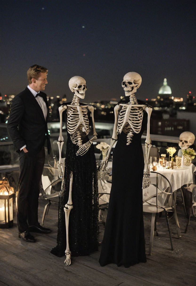 skeletons at a rooftop cocktail party in black tie and cocktail dresses