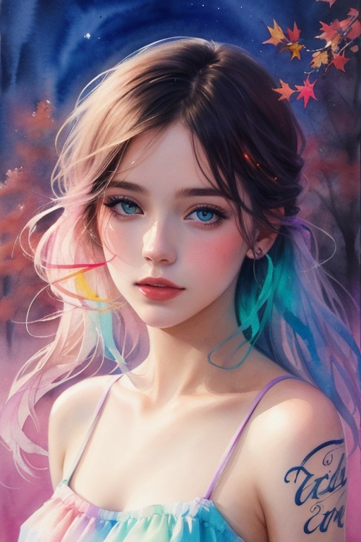 (8k, best quality, masterpiece:1.2),(best quality:1.0), (ultra highres:1.0), watercolor, a beautiful woman, shoulder, hair ribbons, by agnes cecile, half body portrait, extremely luminous bright design, pastel colors, (ink:1.3), autumn lights