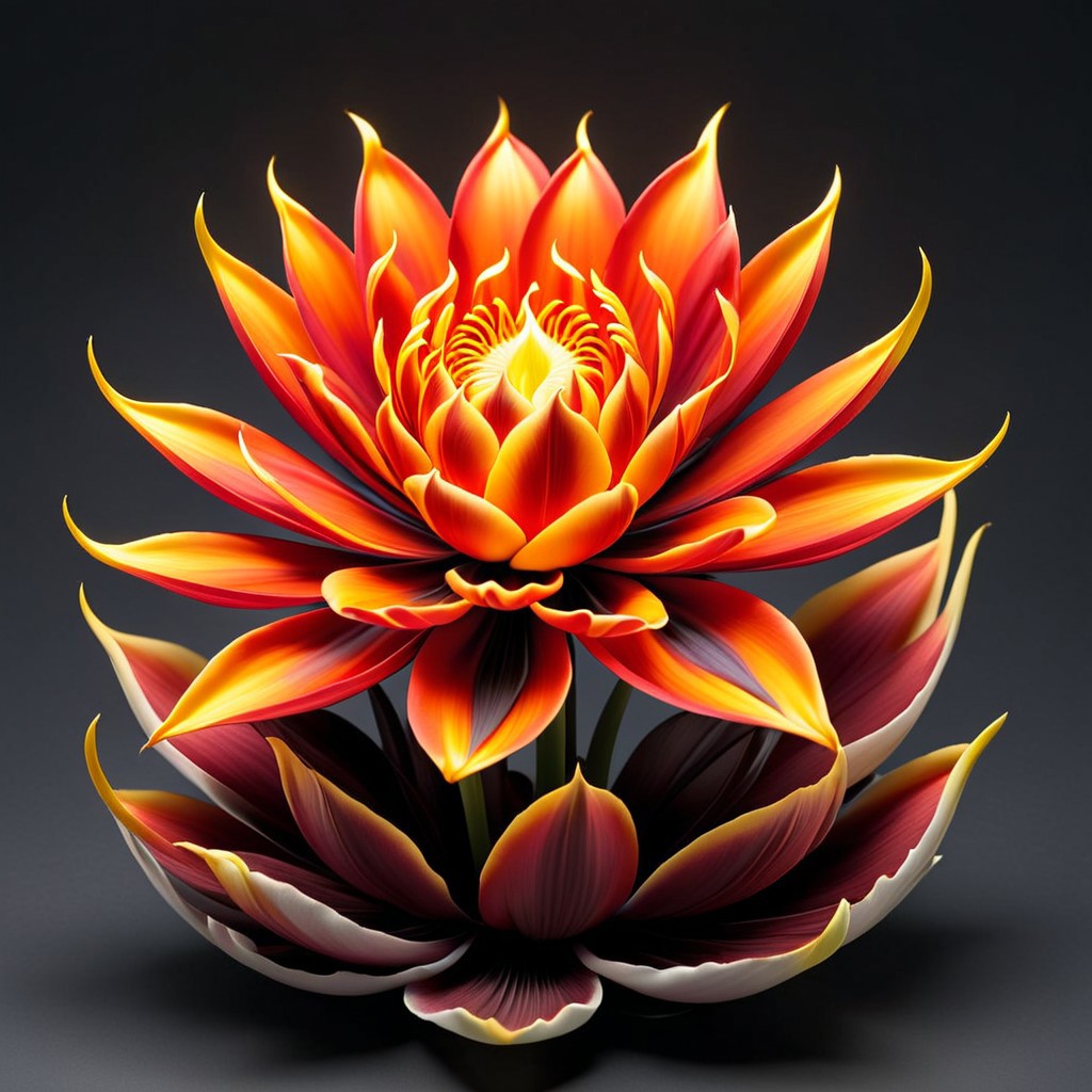 Depict a flower with petals that look like flames, incorporating red, orange, and yellow hues that blend into each other. The edges of the petals are jagged, mimicking the erratic nature of fire. The center of the flower glows like embers, suggesting warmth and the dynamic, consuming force of fire