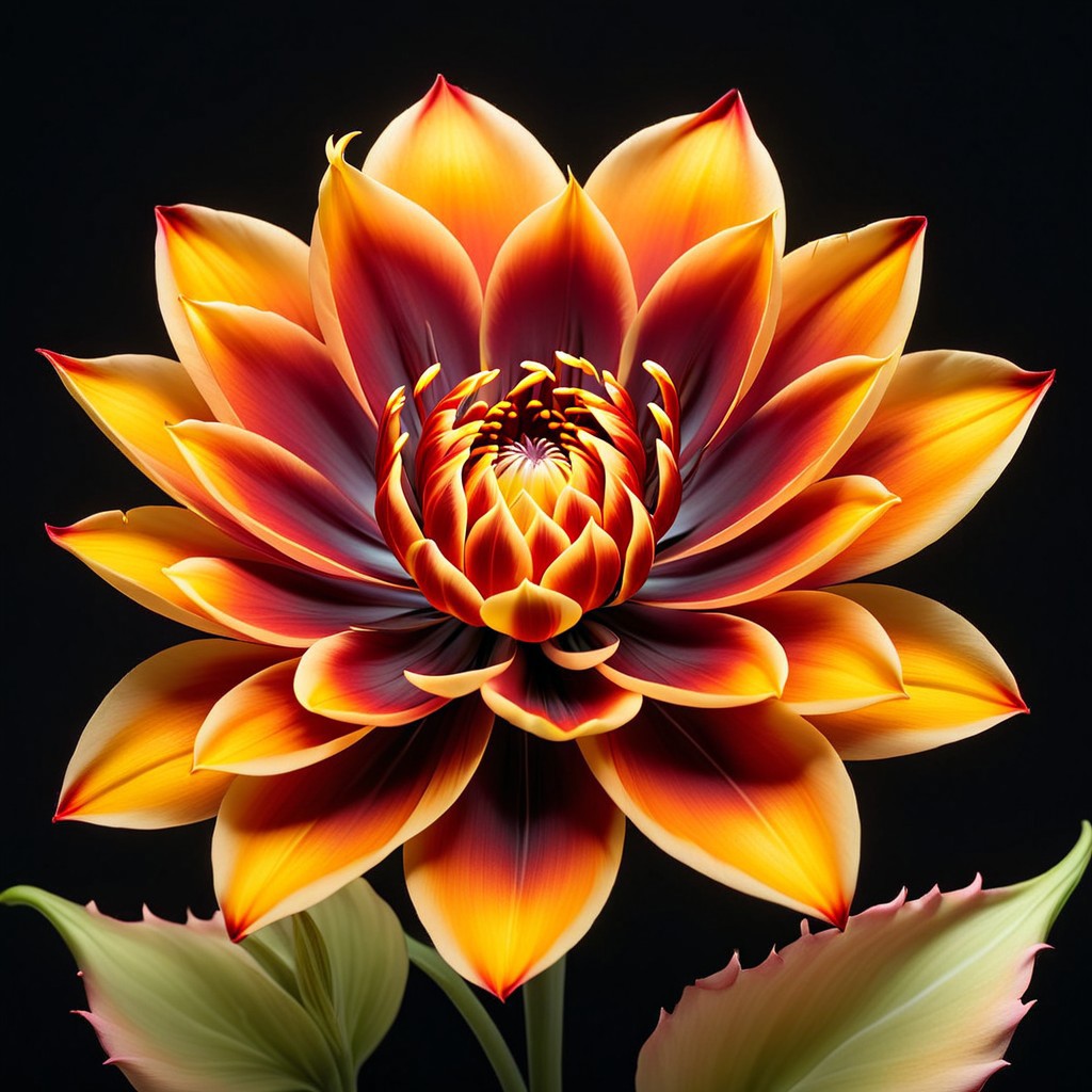 Depict a flower with petals that look like flames, incorporating red, orange, and yellow hues that blend into each other. The edges of the petals are jagged, mimicking the erratic nature of fire. The center of the flower glows like embers, suggesting warmth and the dynamic, consuming force of fire