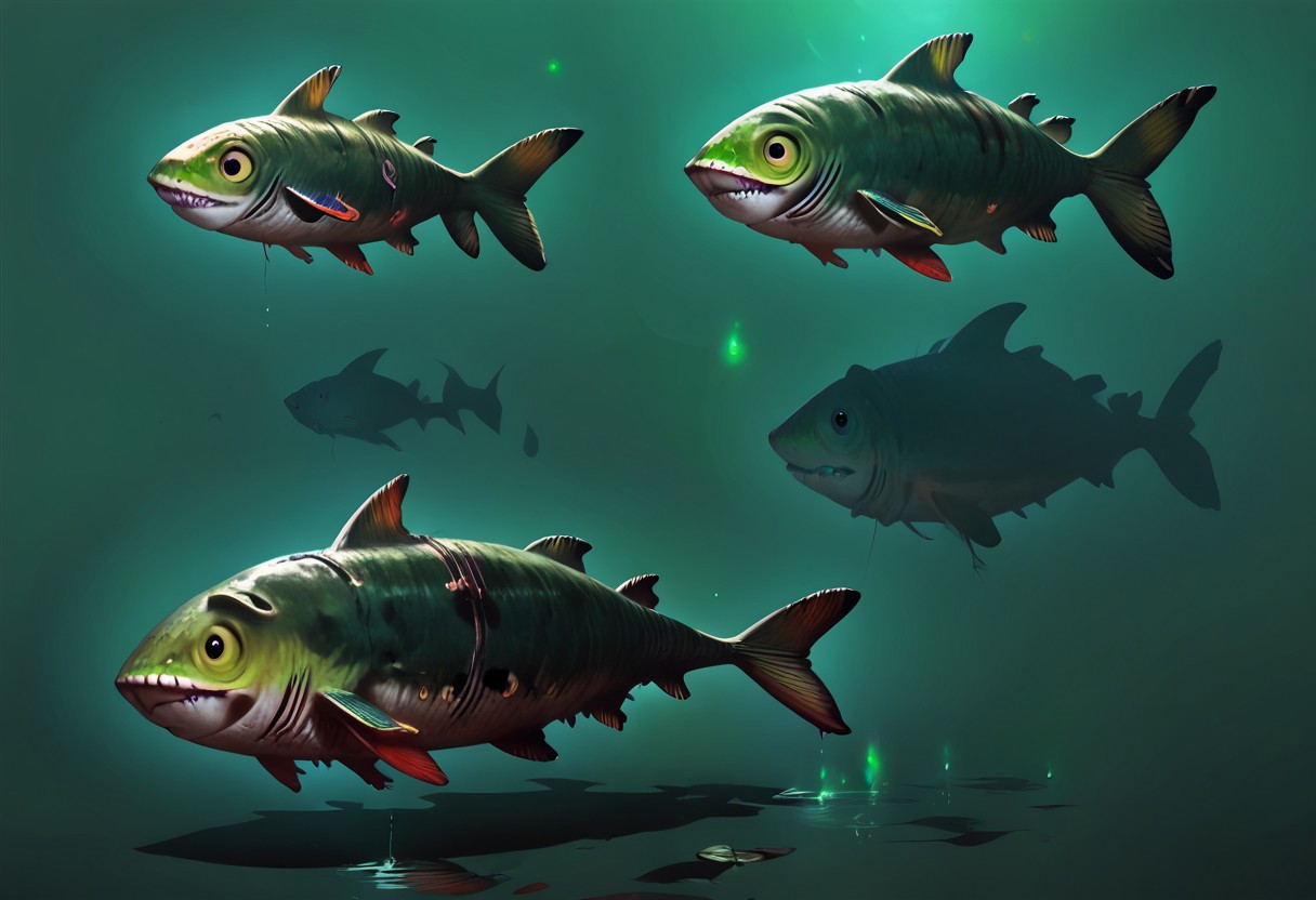 score_9, score_8_up, score_7_up, score_6_up, score_5_up, rating_explicit, source_western, Jabstyle, BREAK, deepocean, Character Design page, several views on sheet, (side views only:2), no humans, humanoid, antro, page with several different sea fish, 1 view funny fish, random color, BREAK, 2 view ocean fish, random color, BREAK, 3 view beautiful fish, random color, BREAK, 4 view monster fish, random color, BREAK, 5 view ugly fish, random color, BREAK, 6 view fish with mutations, random color, BREAK, bioeliminations, glow spots, glow liquids, wounds, teeth, opened mouth, closed mouth, thick fish, fat fish, ling fish, short fish, big fish, small fish, perfectly drawn, detailed, beautiful, detailed textures, volumetric bouncing lighting, reflections, full fish, full body, (simple green background:2),