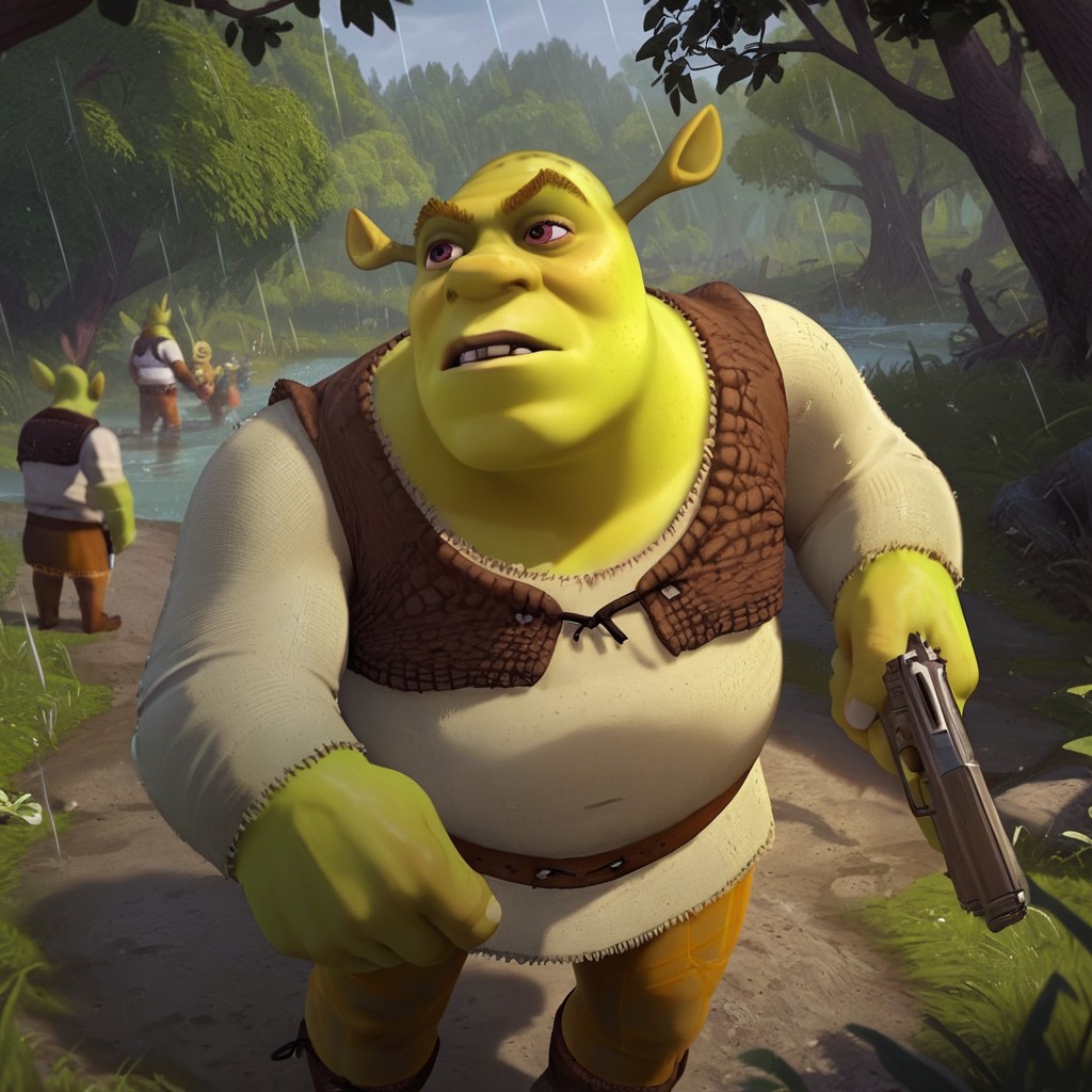 score_9, score_8_up, score_7_up, score_6_up,SHREK, SHREK 2 ON DVD, SHREK, SHREK 2 ON DVD,SHREK, SHREK 2 ON DVD, BIG SWAMP, shrek, ((holding ak47, holding gun)),ready to fight,((massive head)), green skin, cowboy shot, rain, dynamic angle, beautiful scenery, abandon buildings,Donkey1024