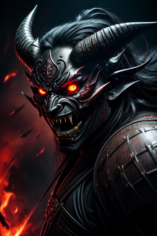 masterpiece, best quality, absurdres, illustration, photorealistic, cinematic, dynamic angle, perfect composition, 1other, oni mask, fearsome expression, glowing eyes, sharp fangs, intricate horns, red and black hues, intimidating aura