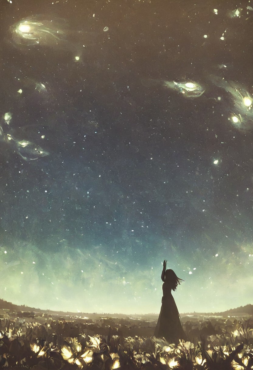 masterpiece, high quality, abstract, 1girl, centered, side view, black silhouette of a girl, (long flowy hair), flowy skirt, green forest background, ((dynamic pose)), ((flowers)), ((glowing butterflies)), night time, dark theme, starry sky, glowing hair, cinematic, vivid colors, ((saturated neon colors)), perfect hands, anzhcdreamwave, aesthetic, Perfect Hands, aurora borealis,novuschroma60 style bokeh, silhouette style, covered in shadow, StarrySkies, scenery, stars (sky), background, night sky, space, rostran style
