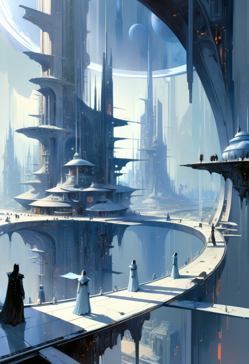 drawix13, John Berkey Style, The Mirror City: A city built of mirrored surfaces that distort the reflection of its inhabitants. Each building reflects a fragmented version of itself, blurring the lines between reality and dream. A solitary figure stands on a rooftop, their reflection a haunting echo, looking towards a shimmering gateway leading into a realm beyond the mirror