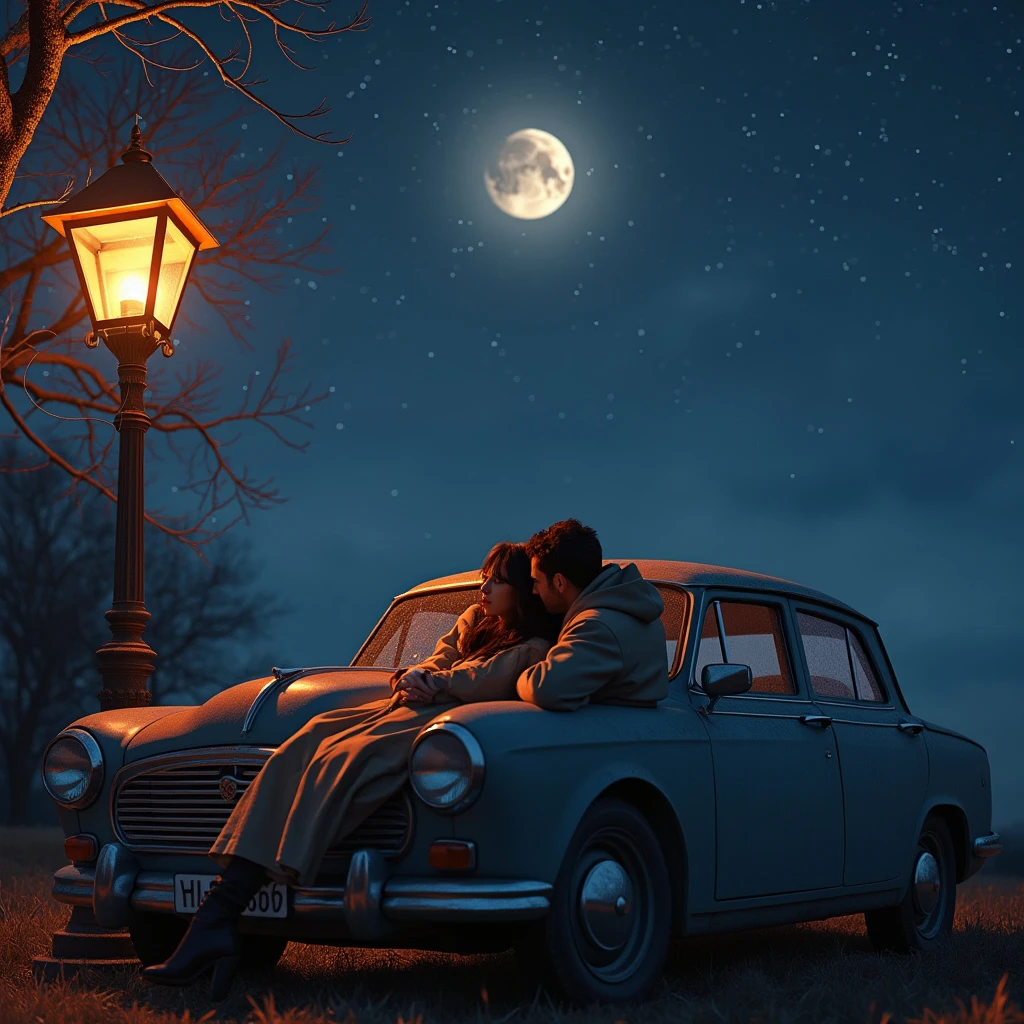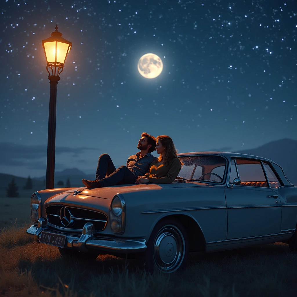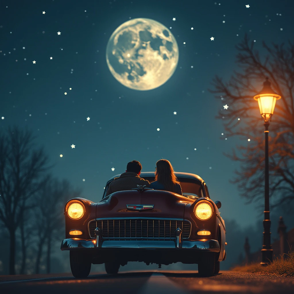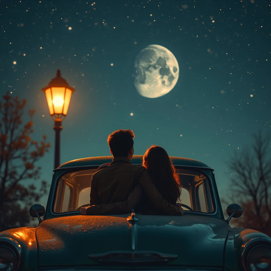 Couple reclining on a classic car hood under a moonlit sky, stars glittering above, Apart from an antique street lamp casting a warm glow on them, their silhouettes gently highlighted in the dark. Festive ambiance, romantic scene, retro-inspired, soft lighting, texture gradient, modest twinkling sky, octane rendering.