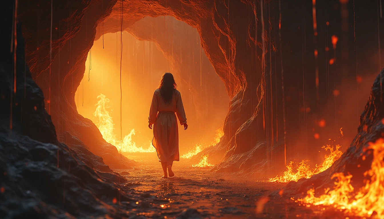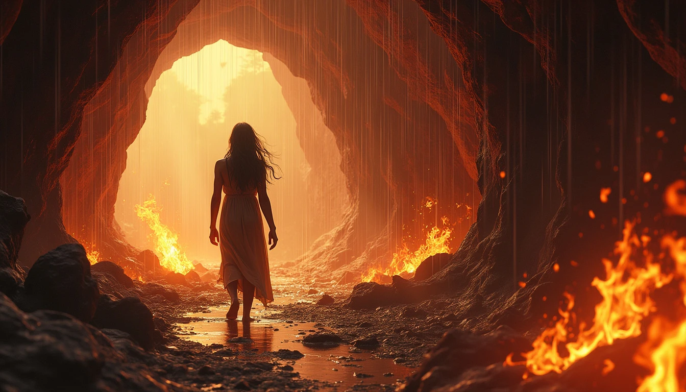 man with full of emotions, following a beautiful woman, middle of fire, rainy burning cave, fantasy art