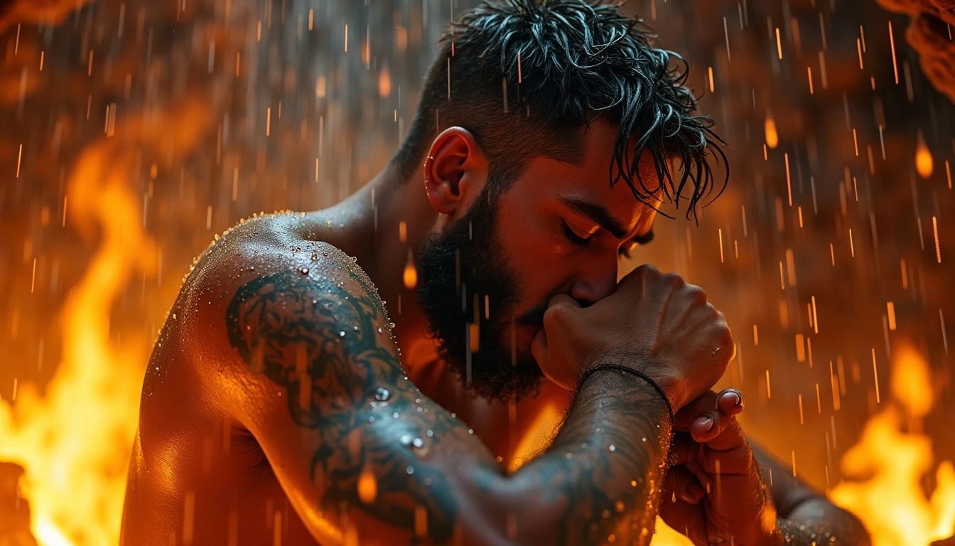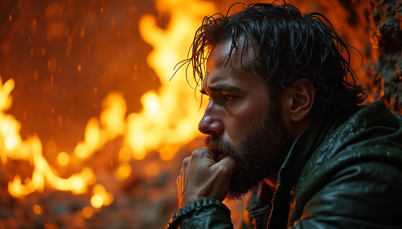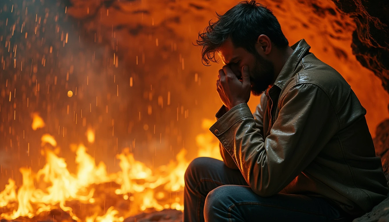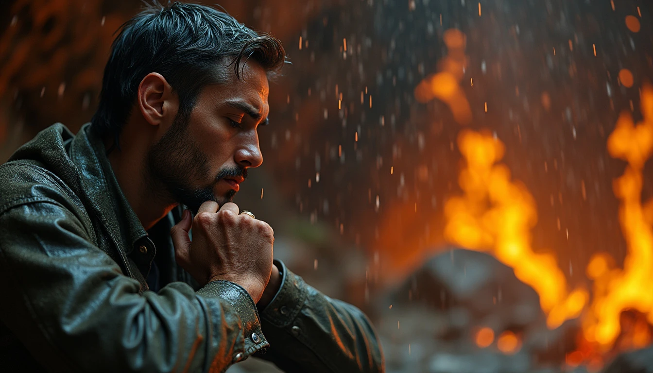 close up shot of a man with full of emotions,consoling himself, middle of fire, rainy burning cave, fantasy art