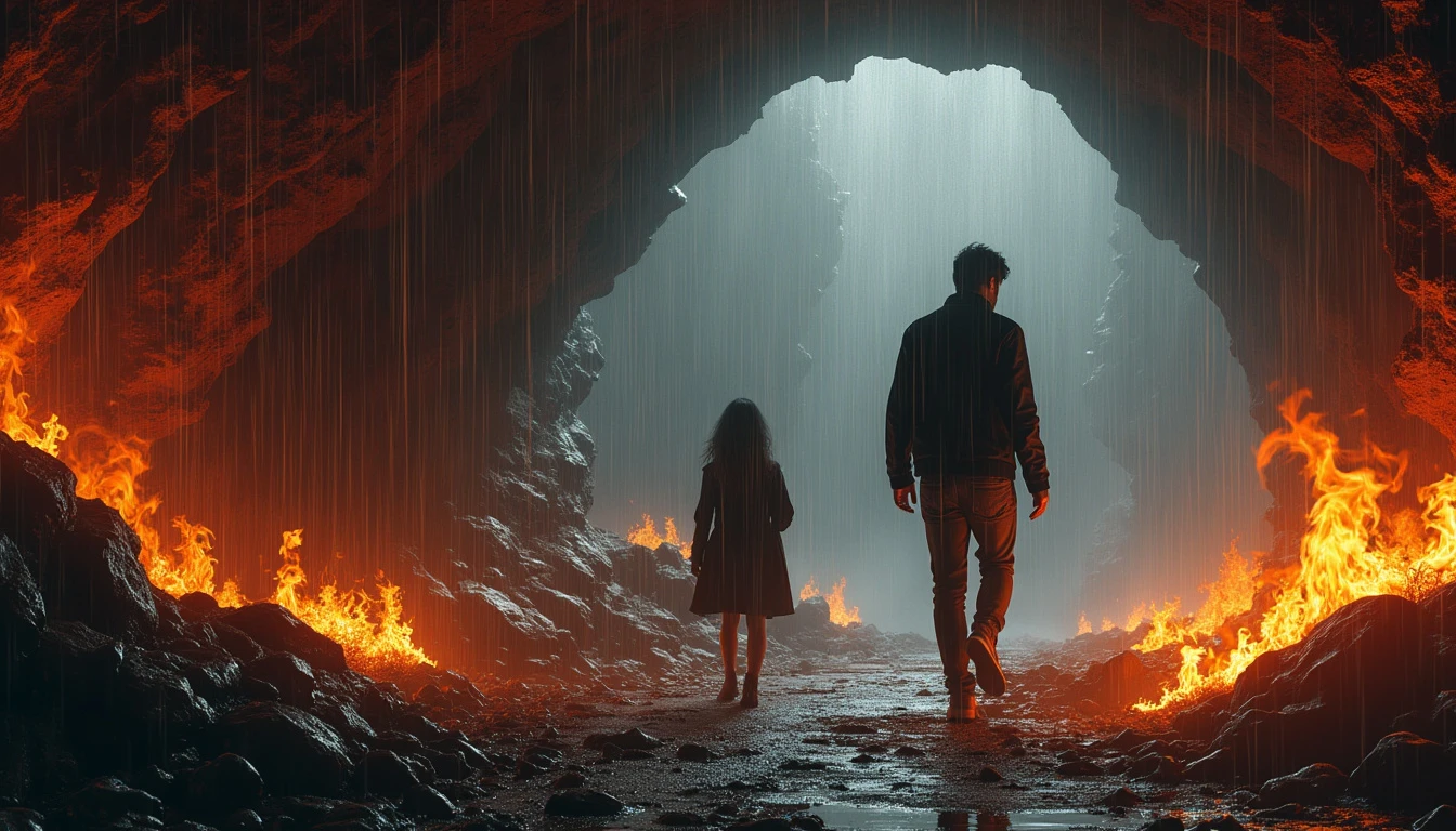 man wearing black jacket with full of emotions, stalking a beautiful woman, rainy burning cave, fantasy art