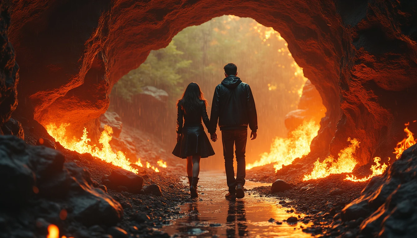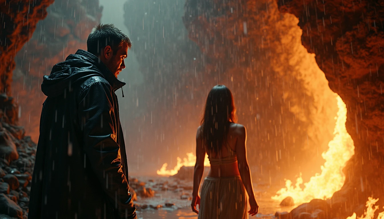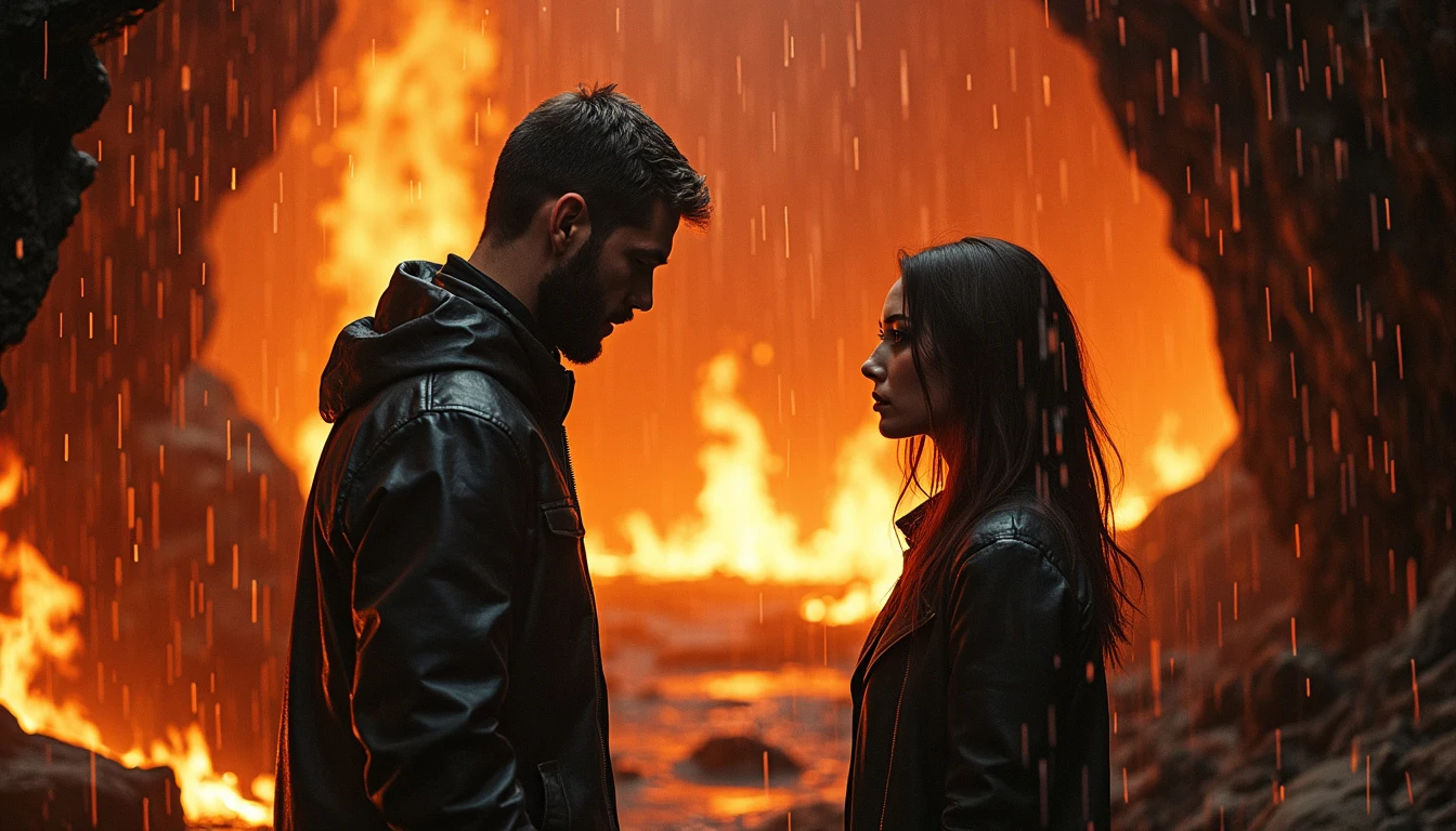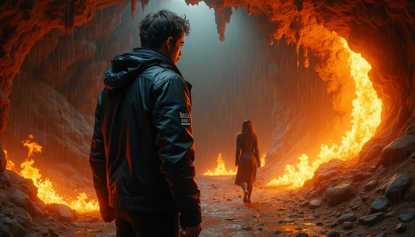 man wearing black jacket with full of emotions, stalking a beautiful woman by fire, rainy burning cave, fantasy art