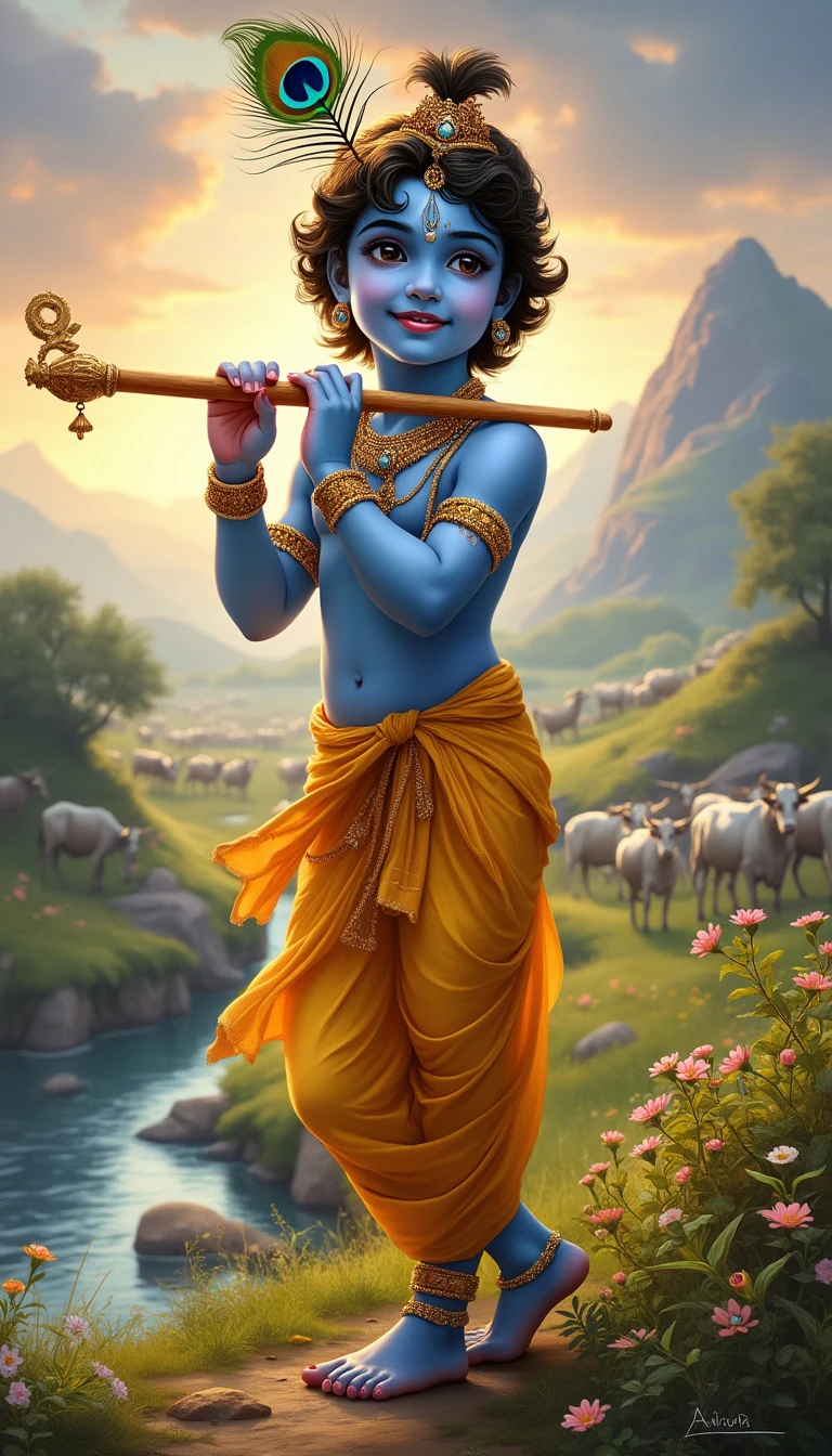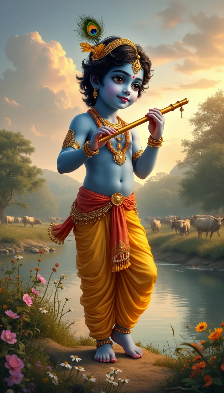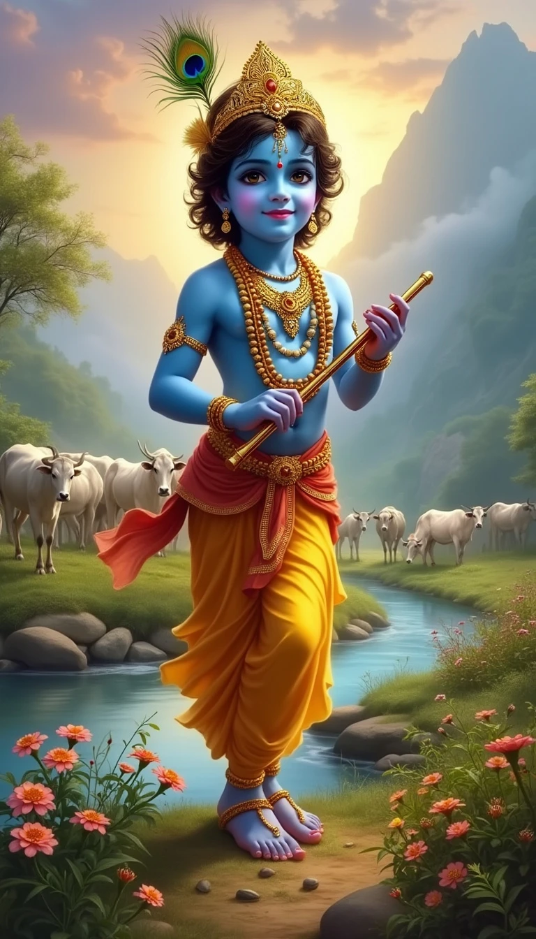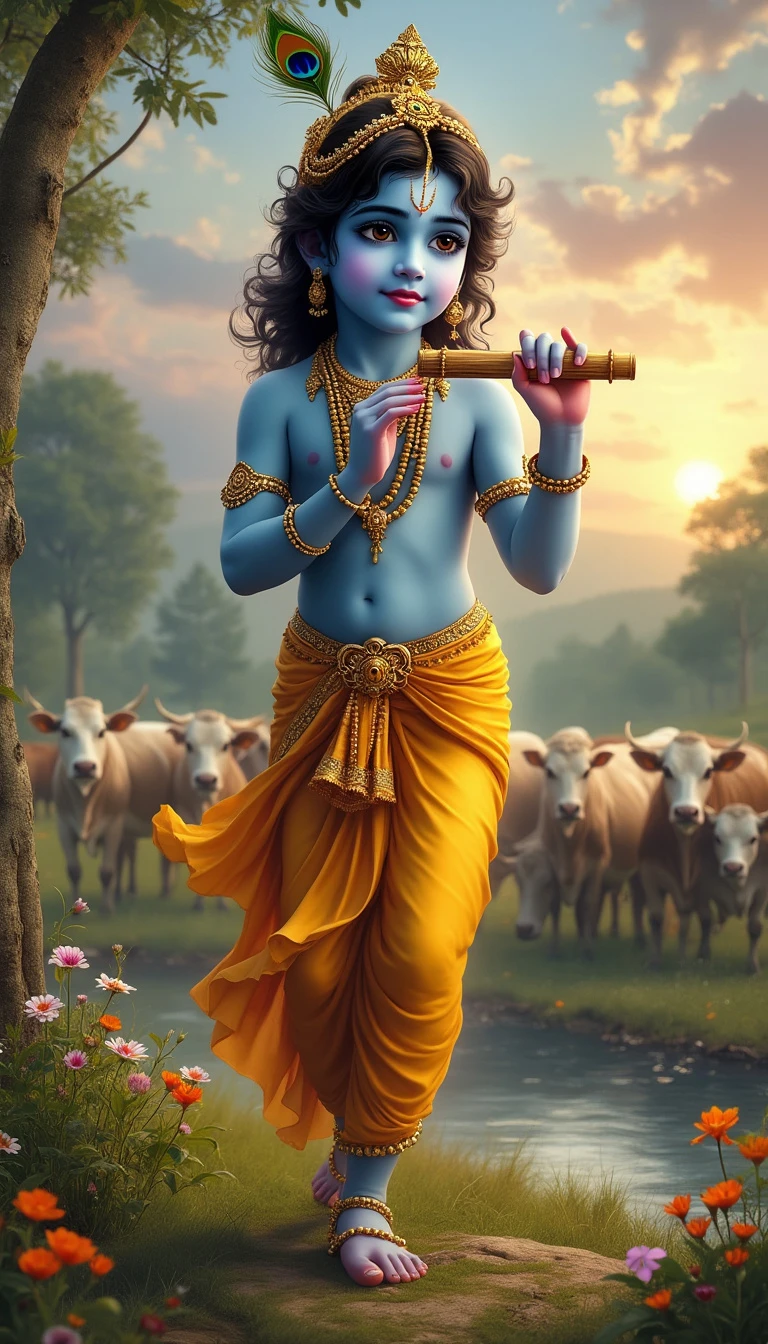Lord Krishna, the divine and enchanting figure from Hindu mythology, stands in a picturesque, pastoral landscape. He has a youthful, radiant face with a serene smile and captivating eyes. His skin is a beautiful shade of blue, symbolizing his divine nature. He wears a flowing yellow dhoti and a peacock feather crown, and is adorned with golden jewelry. In one hand, he holds a flute, and his posture is relaxed and graceful as he stands near a riverbank. The background features lush greenery, blooming flowers, and a herd of cows grazing peacefully. The sky is a mix of warm hues, suggesting either dawn or dusk, and there is a soft, divine glow surrounding Krishna, highlighting his ethereal presence