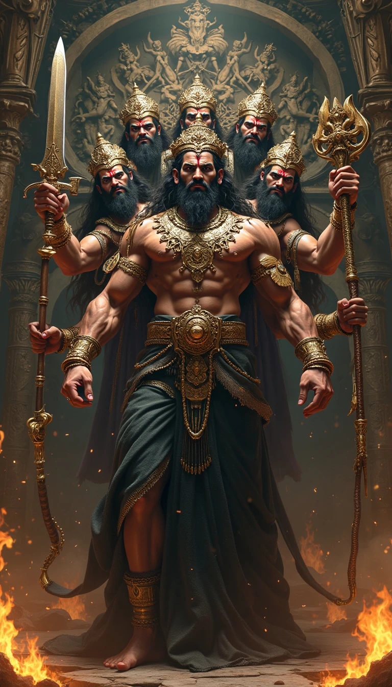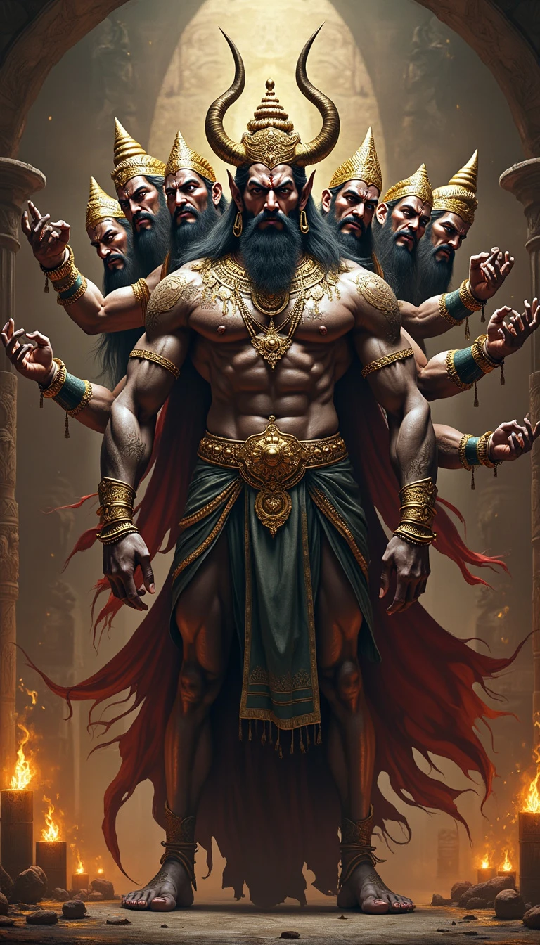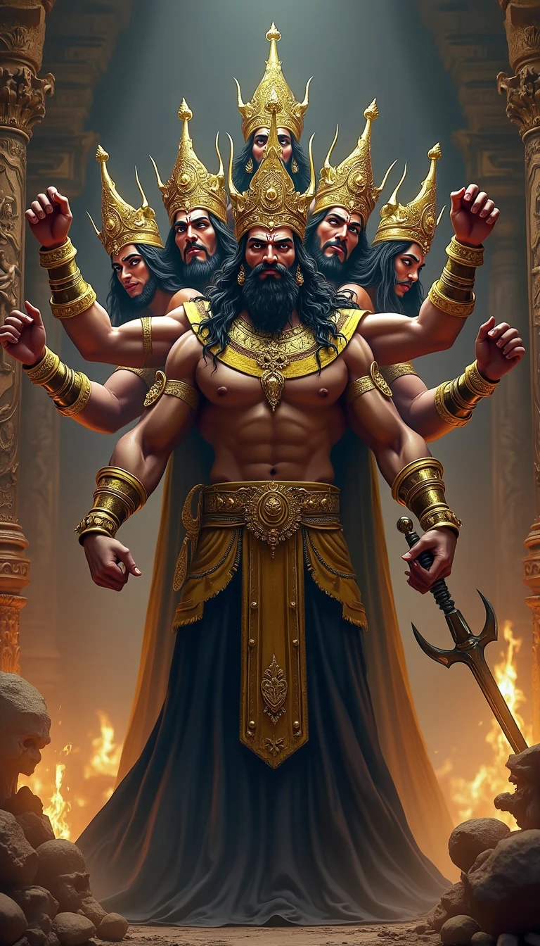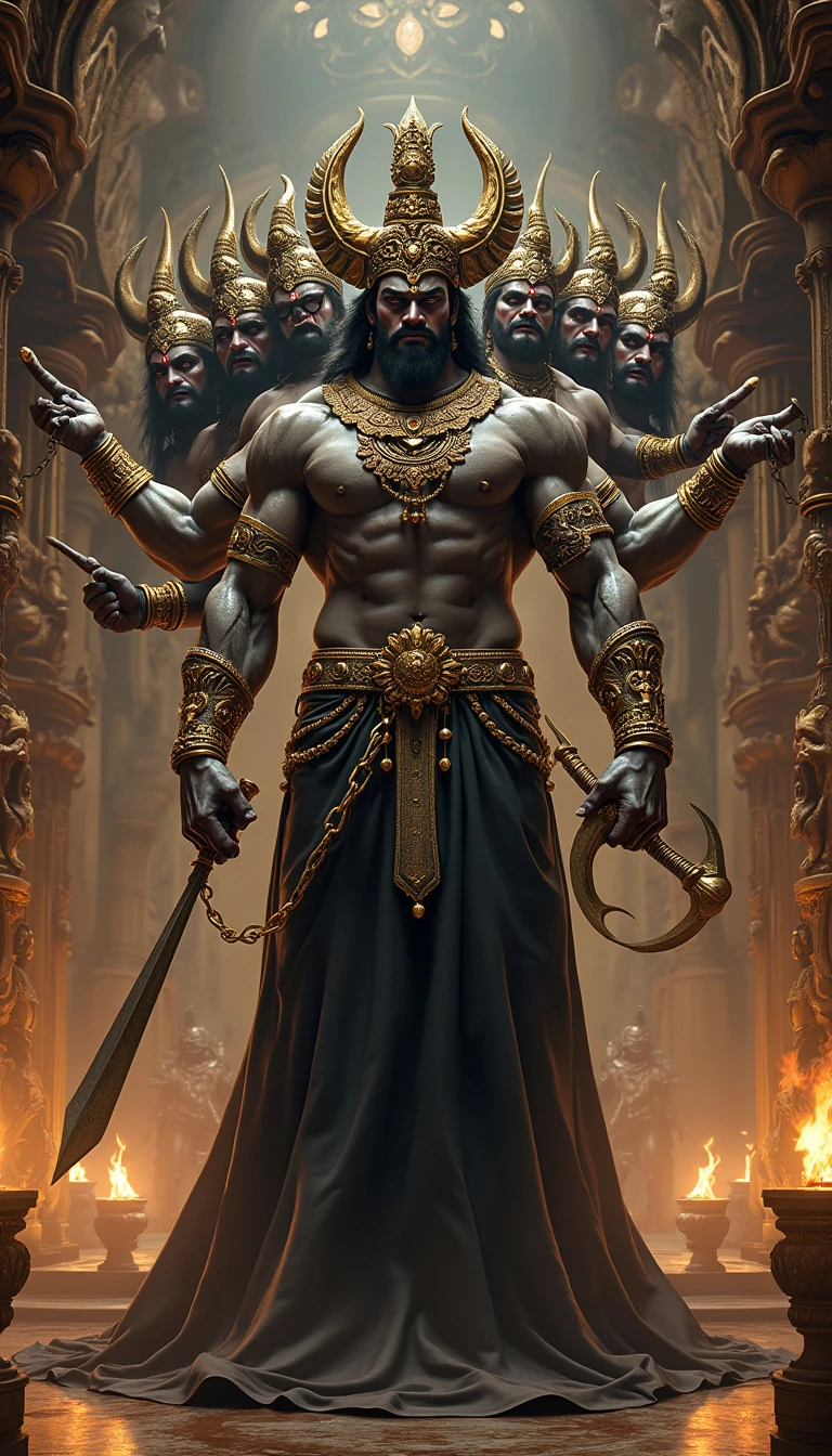 Raavan, the powerful and fearsome demon king from the Ramayan, stands in his grand, opulent palace. He has ten heads, each with a distinct expression, symbolizing his immense intellect and mastery over various arts. His eyes are fierce, and his faces radiate a mix of arrogance and cunning. Raavan's muscular body is adorned with golden armor, intricate jewelry, and a long, flowing black robe. In his many arms, he holds a variety of weapons, including a sword, a trident, and a mace, showcasing his warrior prowess. The background features a grand, dark throne room with towering pillars, burning torches, and intricate carvings depicting scenes of battle and conquest, emphasizing Raavan's might and dominance