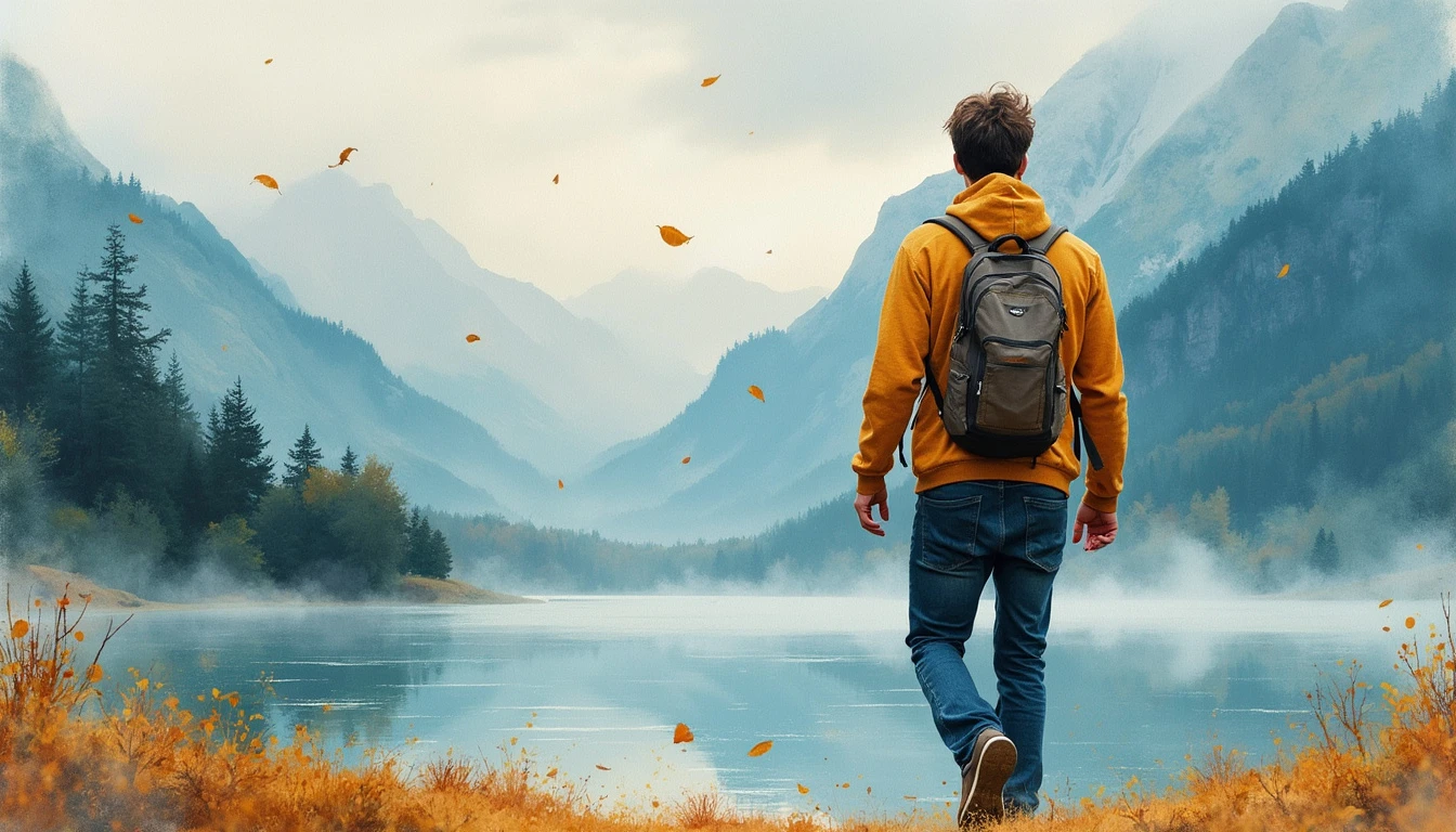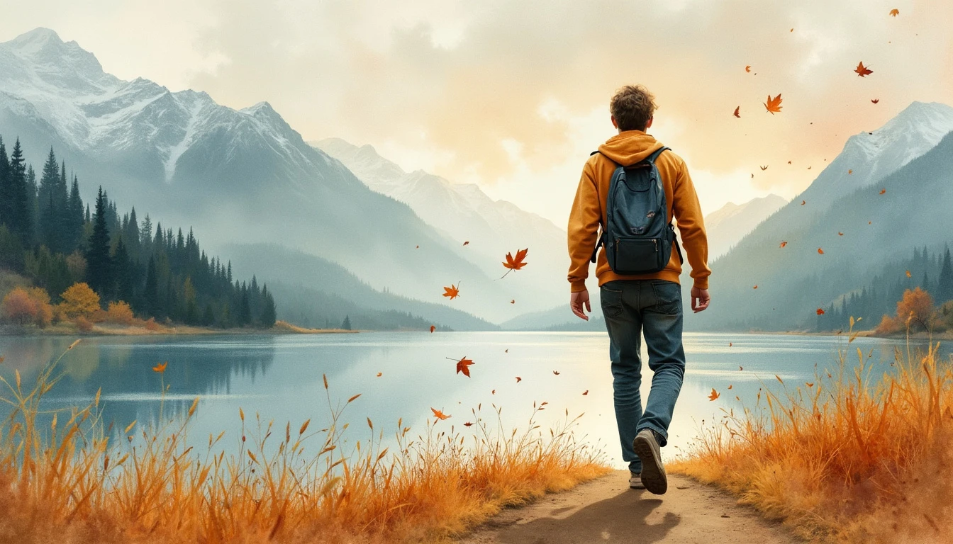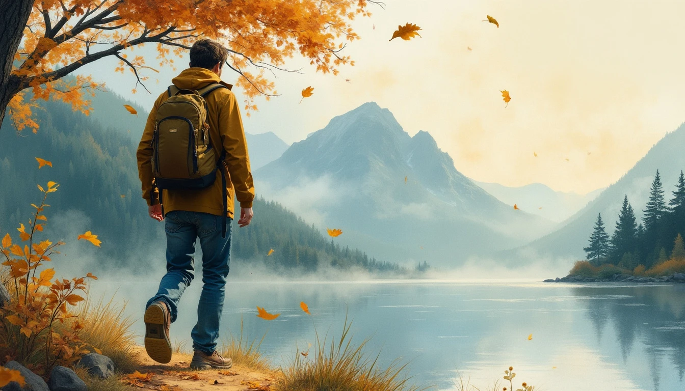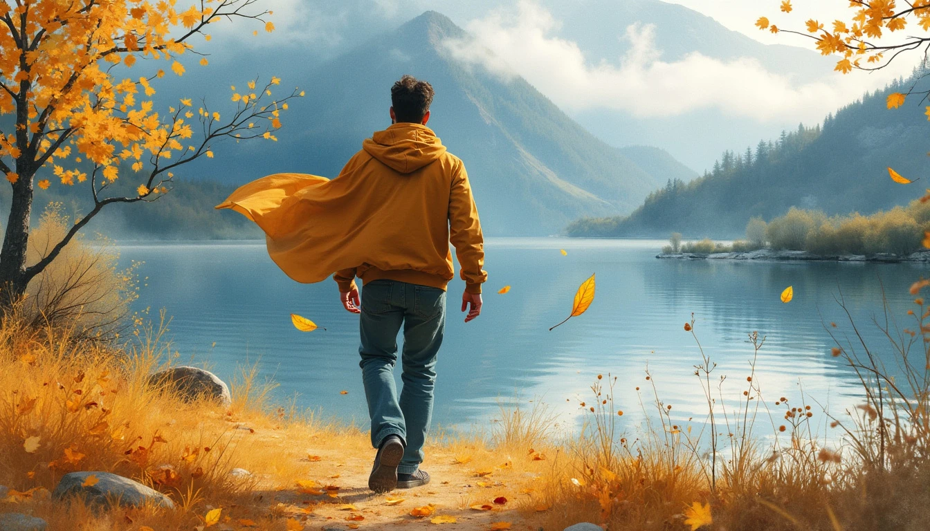 close up watercolor-style painting of a guy walking, leaf falling, with a scenic view of a lake and misty mountains in the background, and their clothing flowing gently.