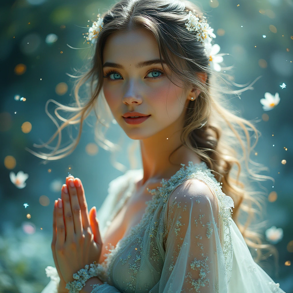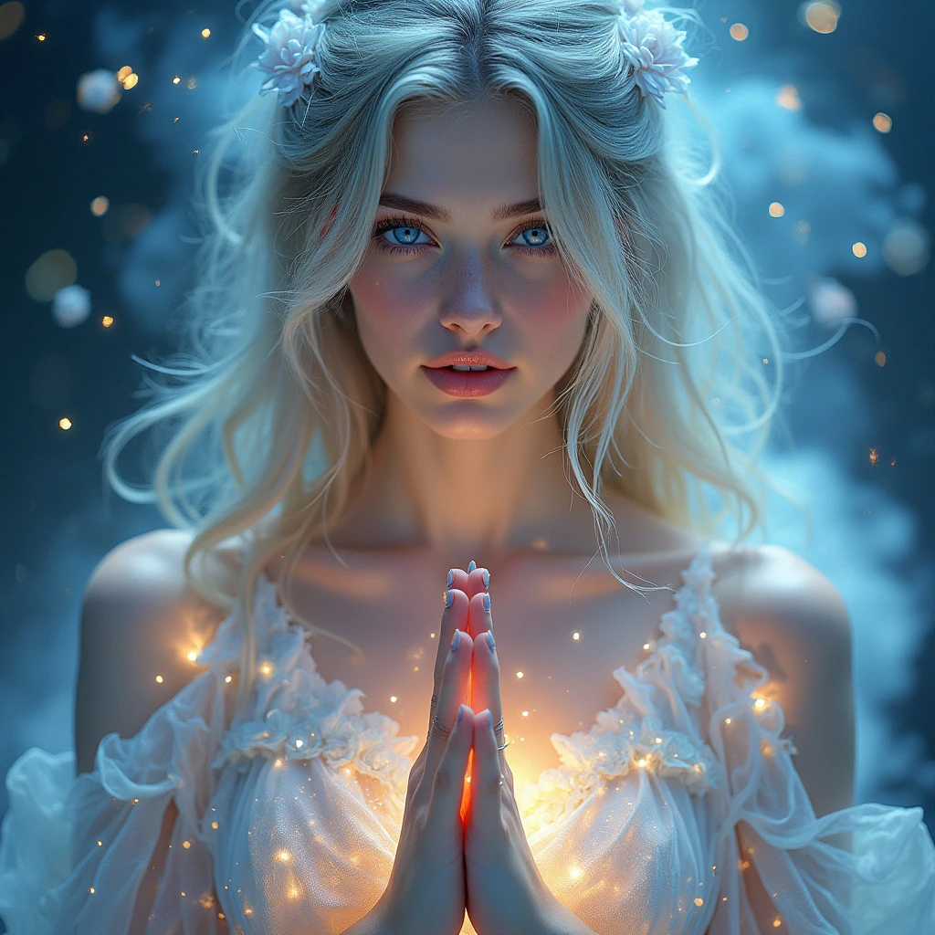 A radiant ethereal woman, beautiful blue eyes, her diaphanous gown shimmering with starlight, performs a graceful namaste gesture, exuding mystical charm. Surrounded by swirling iridescent mists and floating luminescent flowers, she embodies serene fantasy in a dreamlike celestial realm.