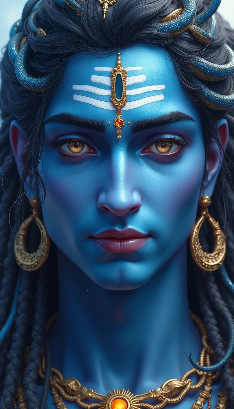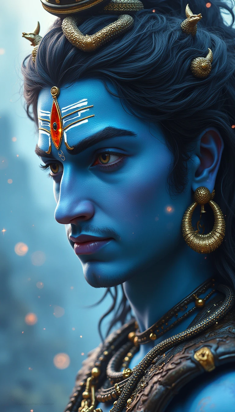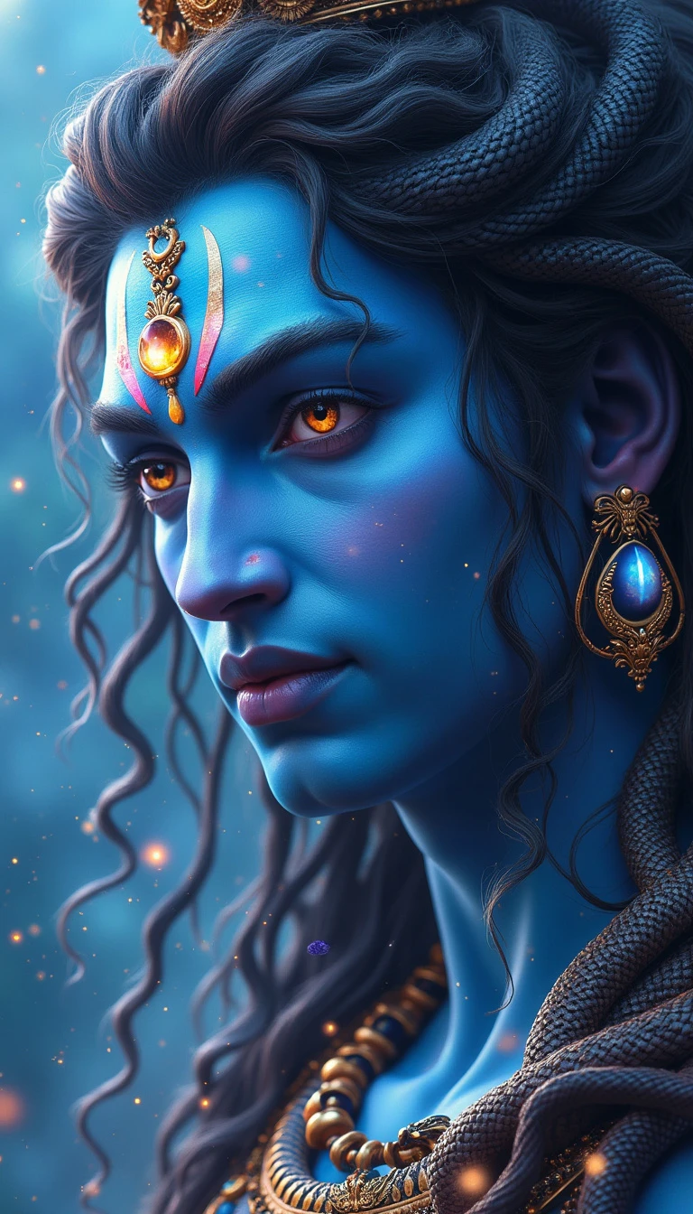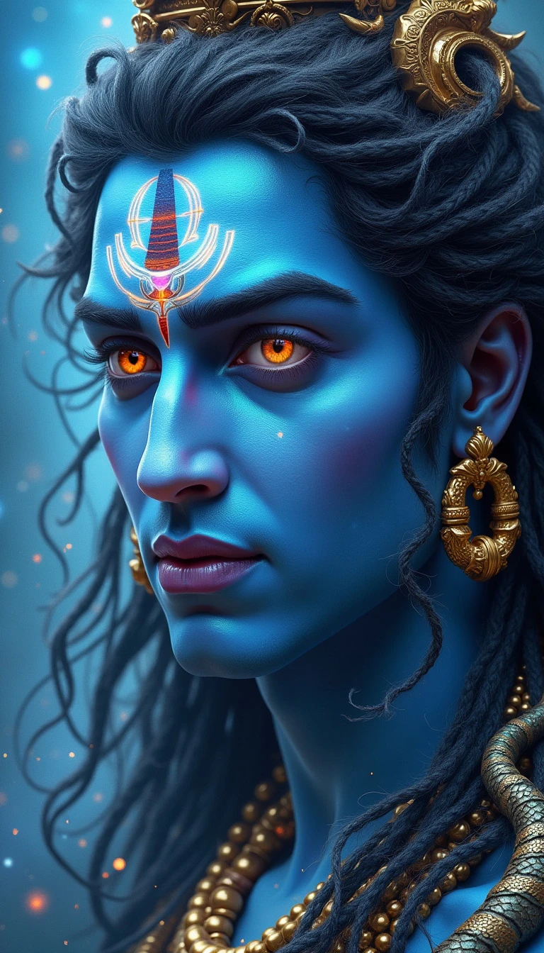 Close-up portrait of Lord Shiva, celestial blue skin radiating divine energy. Third eye glowing with cosmic wisdom. Intricate fantasy armor adorned with serpents. Matted dreadlocks flow like ethereal rivers. Crescent moon crown gleams. Intense gaze pierces through swirling galaxies. Photorealistic digital painting.