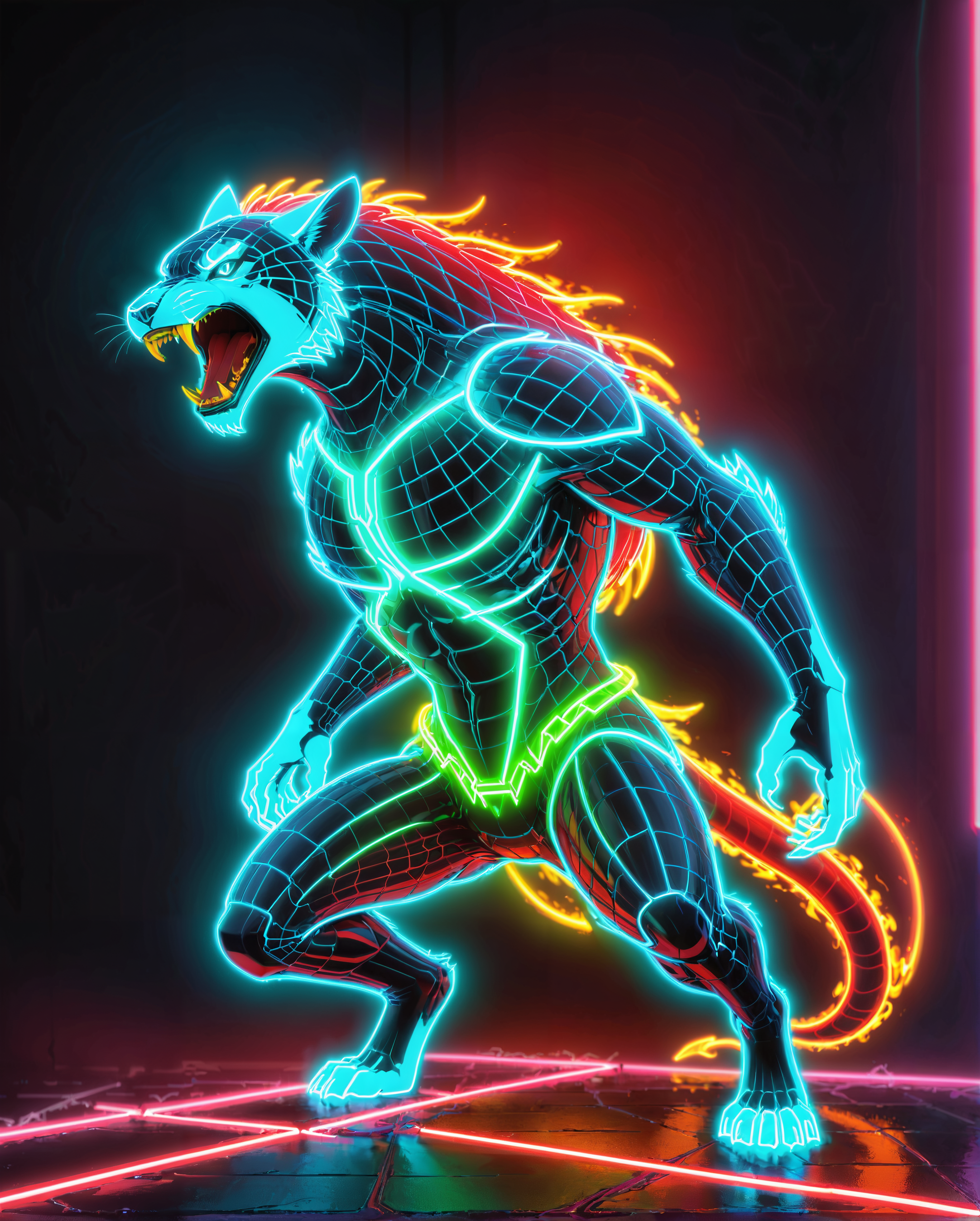 CGI animation,4 animals, 4 animal of elements, (brown earth element, Red fire element, Blue water element, Green air element), elementary furor, rage pose, unrivalled element power, , <lora:Neon_Cyberpunk_Vaporwave_SDXL:1>