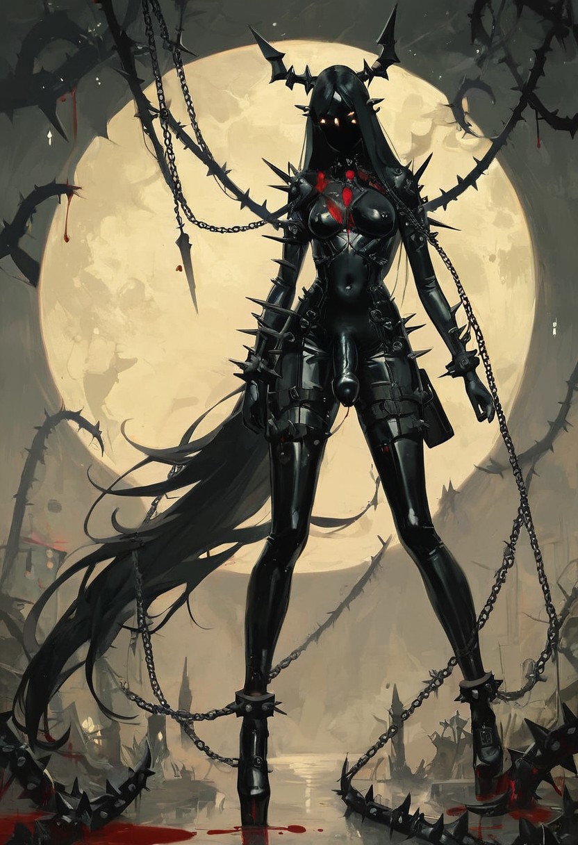 score_9, score_8_up, score_7_up, (character design, sci-fi warrior women, feminine power, perfect anatomy), dark, oscure, night, dark goddess cultist, dark goddess LaTeX cultist, explicit, medium breast, Futanari, chains, spikes, thorns, (gore, blood)