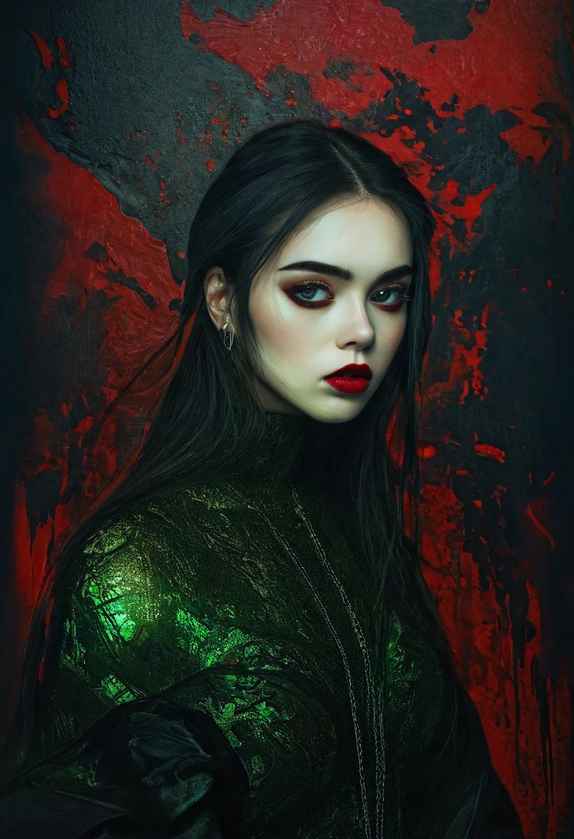 A high angle portrait shot of a defiant young woman with dark hair and crimson red lips, wearing bold makeup and a delicate, intricate chain around her throat, in a dark, textured background filled with abstract digital elements and glitch effects, with a mysterious and eerie mood, vibrant neon greens and reds highlighting her features and cybernetic details subtly integrated into her attire, pale skin emphasized by dramatic lighting, big realistic detailed light eyes, shiny eyes, ultra scary detail, beautiful face, ultra detailed skin textures, complex dress, masterpiece, wild long shiny hair style, beautiful ultra detailed vibrant tattoo on shoulder, shot with a Sony A7, 50mm f/1.4 lens, Double Exposure Style, Volumetric Lighting, Chiaroscuro, luminism photograph:1.5, extremely detailed cinematic film still photography