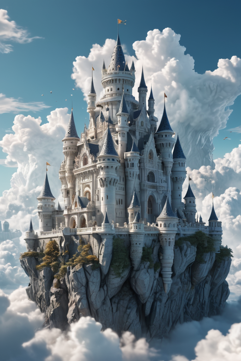 A majestic, floating castle, surrounded by a sea of clouds. The castle is made of gleaming, white stone and adorned with intricate carvings and sparkling gems. Its many towers and turrets reach up towards the sky, and flying creatures can be seen soaring through the air around it. 8K