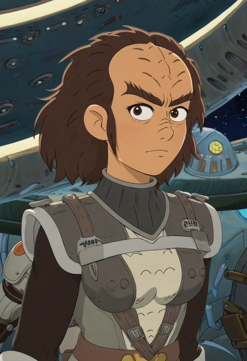 Studio Ghibli Style anime scene of an 18 year old female kling0n alien warrior, forehead ridges, light brown skin, nose ridges, large eyebrows, space station background, cleavage, leather armor