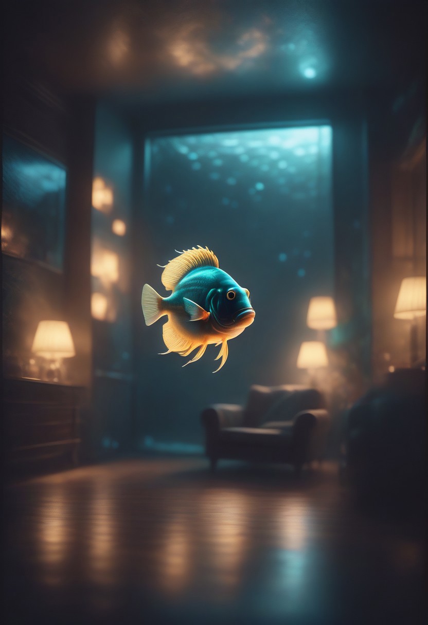 8k analog photo, deep-sea fish swimming in the air in the luxury living room, minimalist,
