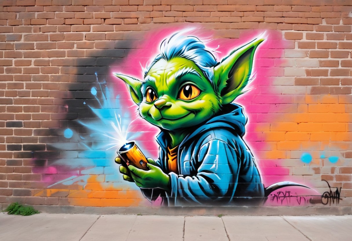 graffiti, pastel, graffiti on brick wall, spray paint on wall, colorful graffiti, street art, spray paint, street canvas, graffiti artist, graffiti art, spray art, spray art, (((old worn brick wall: 1.4))). Moral on the wall of the house. goblin mage examining a relic,