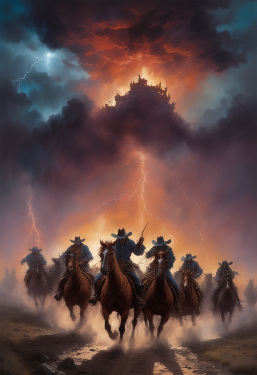 A surreal, nightmarish scene of ghostly cowboys riding skeletal horses through stormy night skies. Wispy, translucent forms of the riders glow with an eerie blue-white light against dark, roiling clouds. Their tattered clothes and wide-brimmed hats flutter in an otherworldly wind. Ahead of them, in the sky above the cowboys ((a herd of demonic cows, with glowing red eyes and smoke trailing from their nostrils thunder across the sky)). Lightning illuminates the scene in stark flashes, revealing glimpses of the tortured landscape below. The composition is dynamic, with the riders and cattle moving from left to right across the image. Use a color palette of deep purples, midnight blues, and fiery oranges for the sky, contrasting with the spectral glow of the riders. Emphasis on atmospheric perspective and dramatic lighting to enhance the dream-like quality. Style: Dark fantasy meets Western gothic, with a touch of comic book dynamism