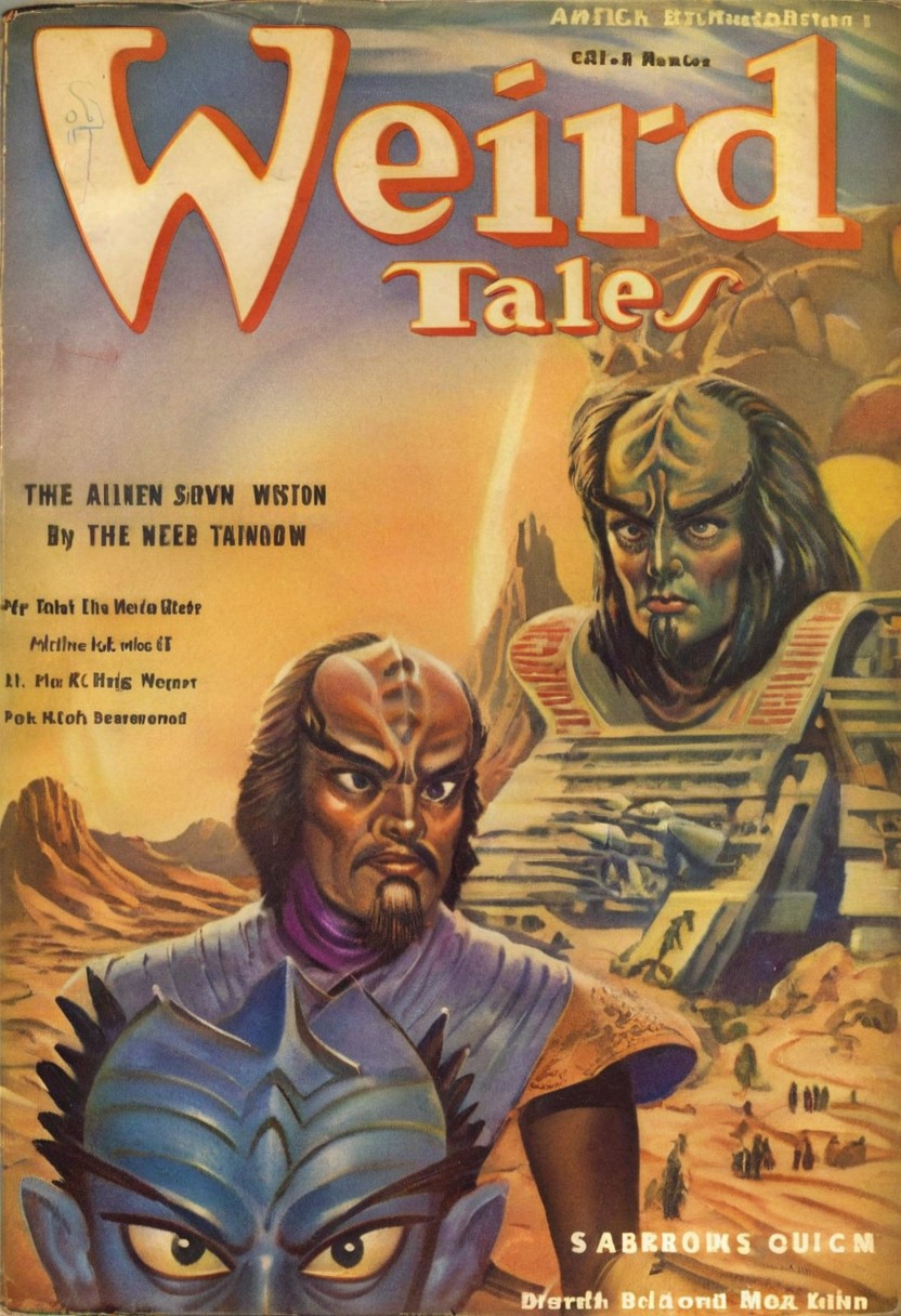 Weird Tales pulp magazine cover, male kling0n alien, forehead ridges, brown skin, nose ridges, large eyebrows, standing on a desert planet with a retro futuristic city far in the background