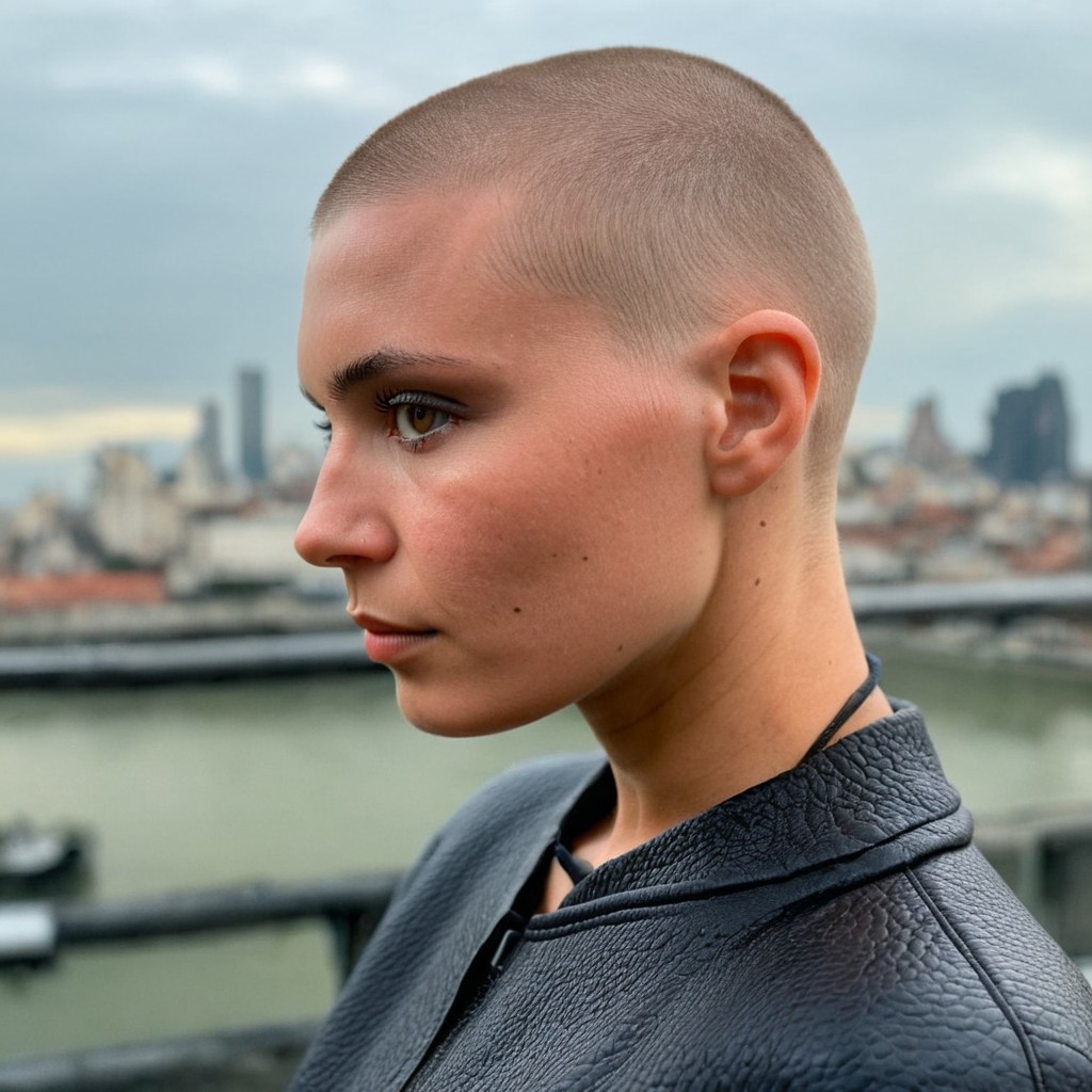 Buzzcut, no hair, bald, Blade Runner style, (Skin Texture, pores, natural,iPhone,RAW)), natural lighting, Highest Quality closeup Portrait photo of a woman wearing no makeup with a ((buzzcut)), side view, profile, silver eyes, Nikon Z9, realistic matte skin, blurry city in the background, 8K,