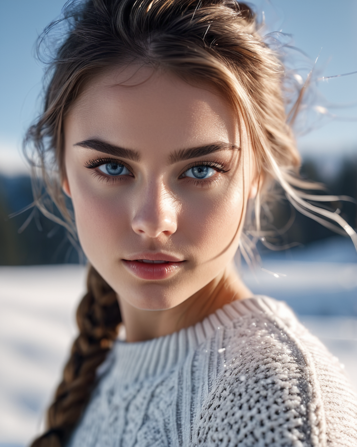 Upper body photo. Beautiful girl wearing a thin athletic sweater, Side-swept hair, Perfect eyes, highly detailed beautiful expressive eyes, detailed eyes. Depth of field, morning in the snow, (8k, RAW photo, best quality, depth of field, ultra high res:1.2), (intricate, photorealistic, masterpiece, ultra-detailed), dynamic lighting