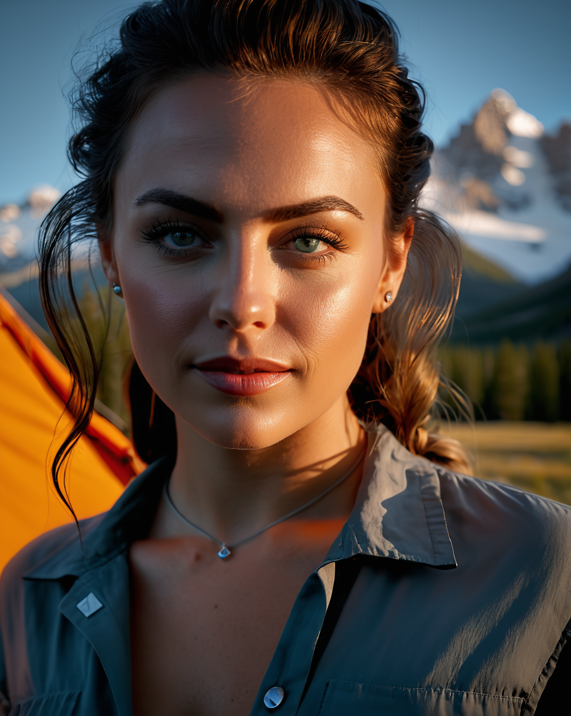 1Female. Camping, tent, campfire. Women's Jumpsuit Casual Romper Button Front V-Neck. Cleavage. perfect eyes, highly detailed beautiful expressive eyes, detailed eyes. Crimped Waves hairstyle. Yellowstone National Park, vast open view in the background. Professional photoshoot, (8k, RAW photo, best quality, depth of field, ultra high res:1.2), (intricate, photorealistic, masterpiece, ultra-detailed), dynamic lighting.