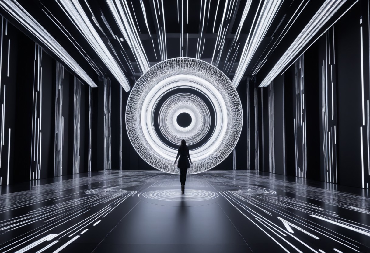 Black and White Kinetic, Kinetic aesthetics, visual dynamism, immersive experience, transparent elements, light interaction, dynamic patterns, mesmerizing visuals, interactive art, play of light, movement exploration, sensory engagement, optical illusions, spatial depth, rhythmic patterns, perceptive art, immersive environments, engaging aesthetics, interactive perceptions, sensory experiences, spatial manipulation, vibrant colors.