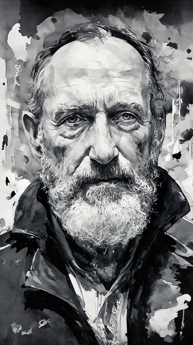 the head and shoulders of an elderly man with a beard, in the style of nautical surrealism, intricate compositions, ink and wash, psychedelic dreamscape, celtic art, white and gray, cubist street art