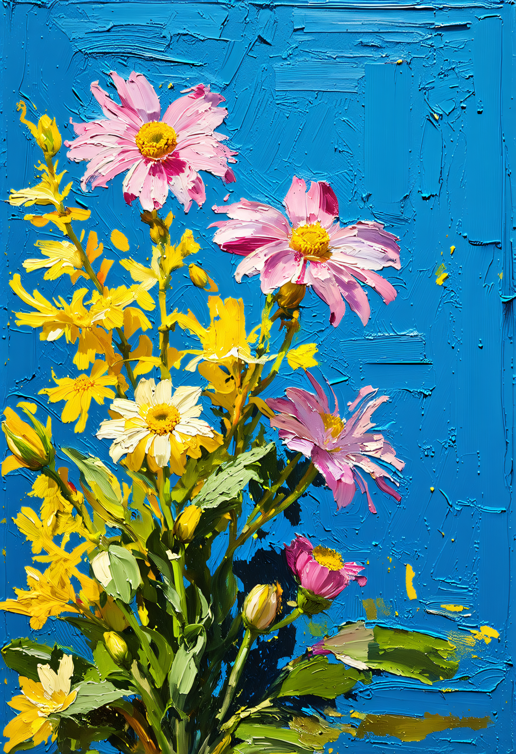 flowers, blue background, oil painting, rough stroke, line graphic, geomatric, generate an image with the rich texture and thick brushstrokes characteristic of an oil painting. Emphasize the thick brushstrokes spread across the entire canvas, blending of colors, and the play of shadows