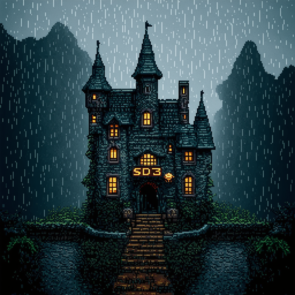 pixel dark dull monochromatic eerie goth gothic castle placed at pixelated 16bit game level, rainy moody , selective focus, bokeh, depth of field attention-grabbing,grainy film kodak footage quality, text "SD3"