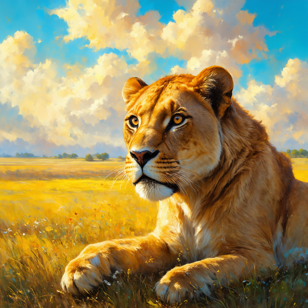 Dream illustration, fairytale-like, Oil painting, 8K,k hd, A large lioness roared, Background, Beautiful steppe plains, HD, Golden, Light yellow, Light blue-green, carmine, verde claro, sunrise colors, Golden glow atmosphere (Digital drawing:1.2), Comic style, ToonYou Style, Illustrative funk, Counterwave graffiti, Perspective view, Extreme Face Close-Up, tee shirt graphic, Ultra HD, Realistic, Vivid colors, Highly detailed, Ultra HD drawing, pen and ink, Perfectcomposition, beautiful detailed intricate insanely detailed octane render trending on artstation, 8K art photography, Arte conceptual fotorrealista, soft natural volumetric cinematic perfect light