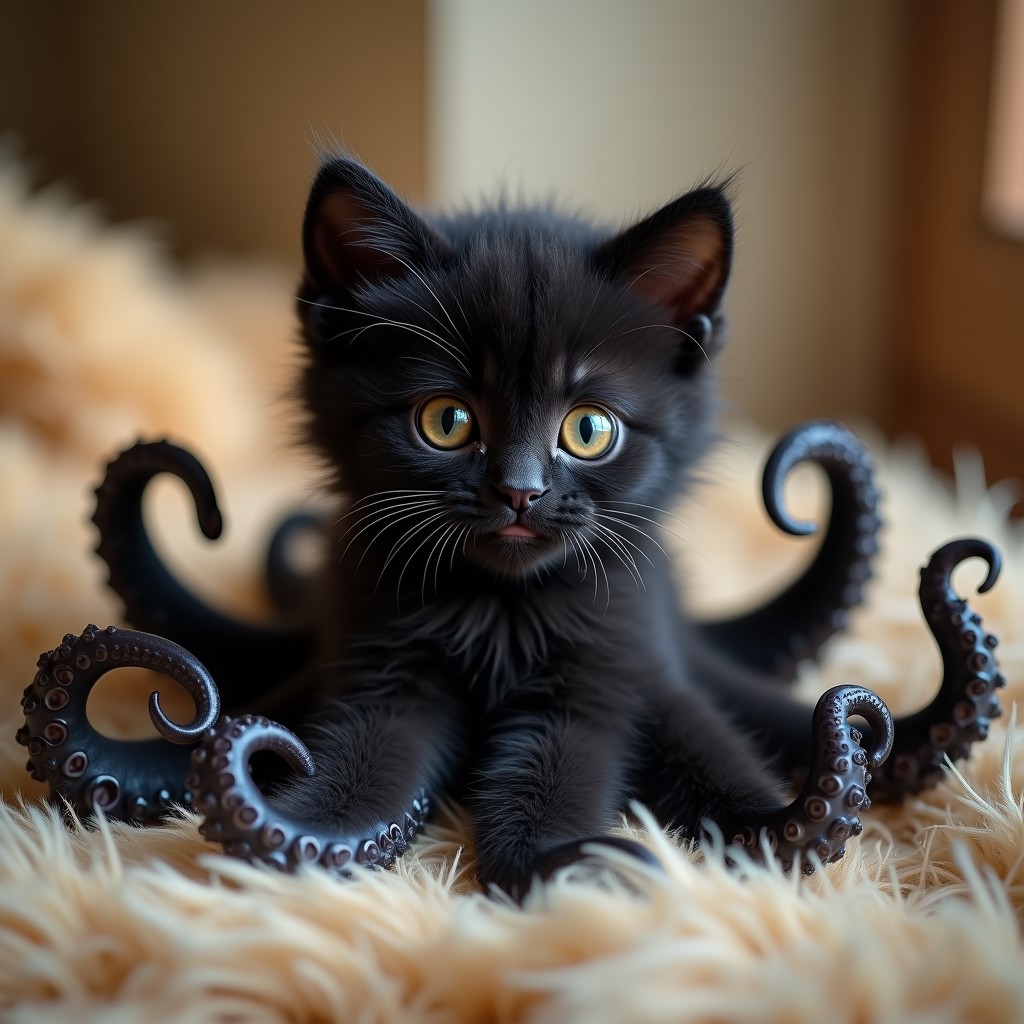 Capture a hyper-realistic photograph of a unique creature, a black octopus kitten. The body of the creature should be a perfect blend of a fluffy kitten with eight octopus tentacles gracefully extending where the legs would be. The fur of the kitten should seamlessly transition into the smooth, slightly translucent texture of the tentacles. The creature's large, expressive eyes should reflect curiosity, while the tentacles display a soft, playful movement. The scene should be set in a cozy, natural environment, with warm lighting that highlights the intricate details of both fur and tentacles, creating an enchanting yet believable hybrid creature