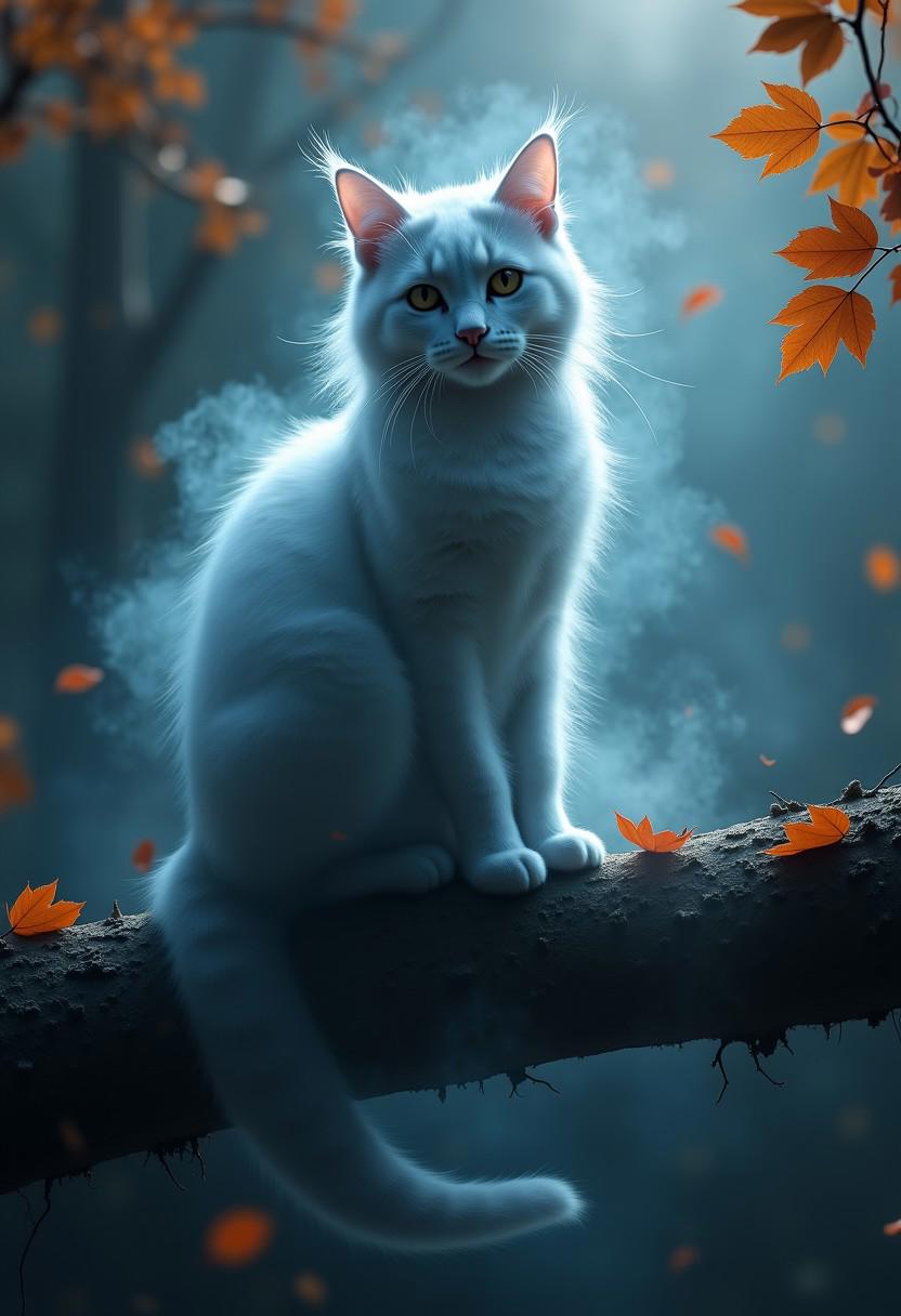 Masterpiece, 4k, 8k, concept art, high quality, highly detailed, (((An etherial cat shadow, made entirely out of smoke mist and fog))), ((engulfed in mist)), sitting on an enchanted oak branch, fantasy setting, autumn leaves, autumn season, absurdres, elemental, dark, night, mystical setting,
